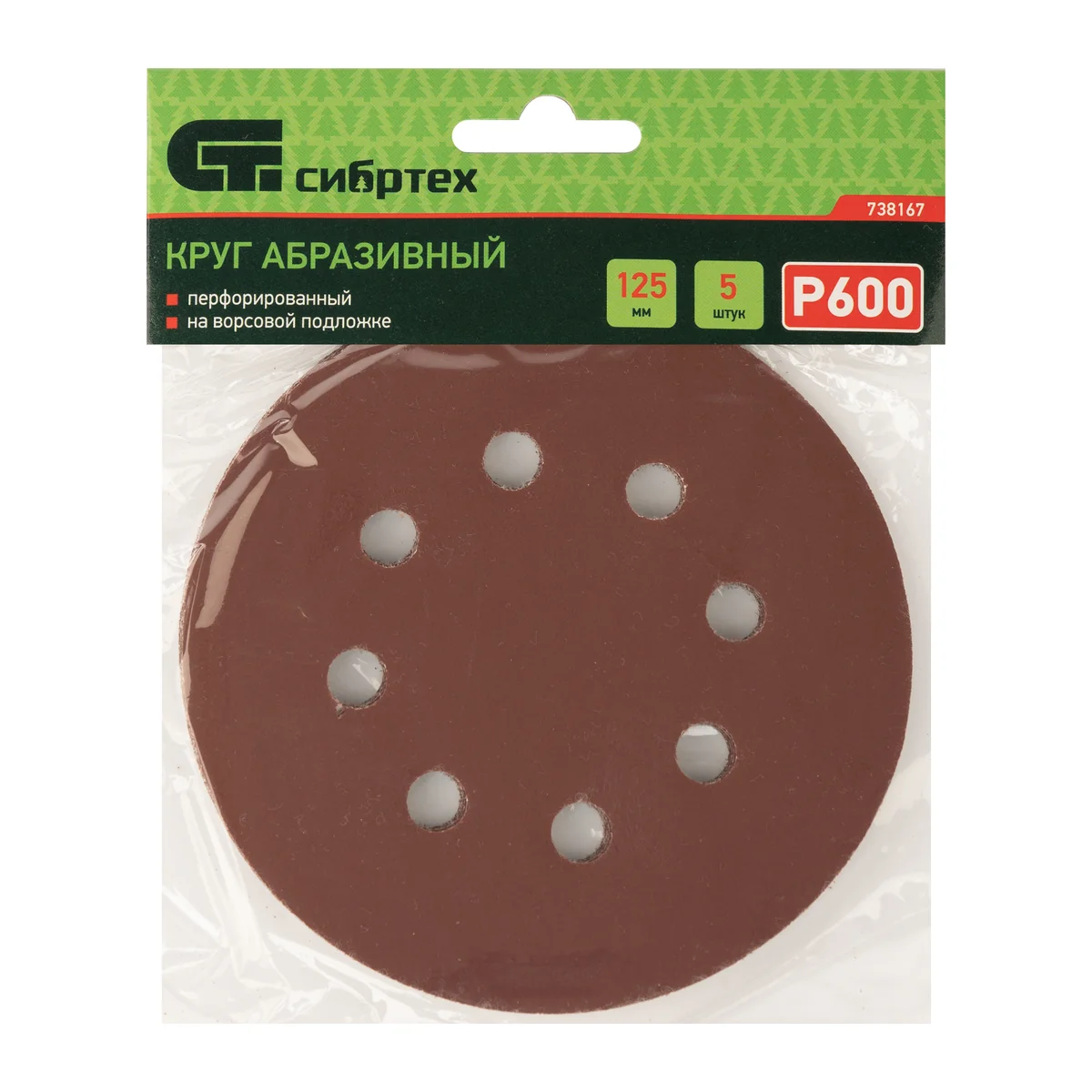 Круг абразивный на ворсовой подложке под "липучку", перфорированный, P 600, 125 мм, 5 шт Сибртех 738167