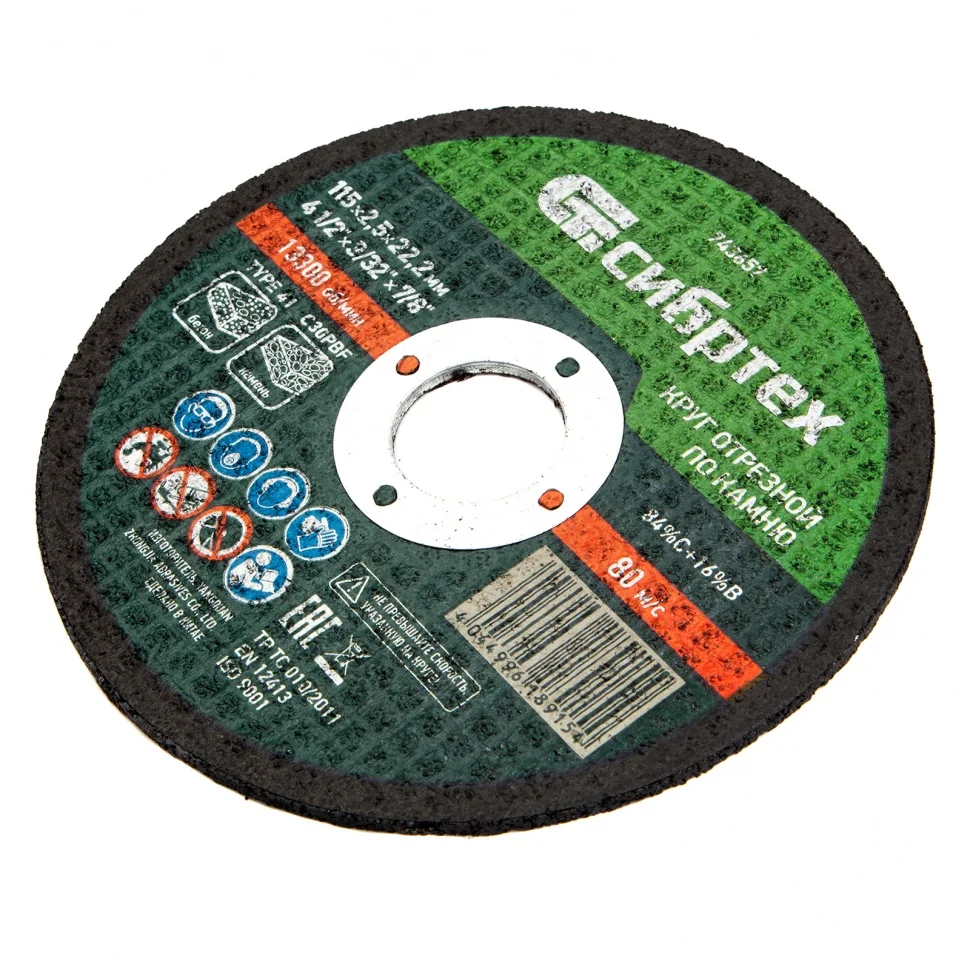 Отрезной круг по камню Сибртех 743657, 115 х 2,5 х 22,2 мм, используется в качестве оснастки на УШМ для сухого реза камня, огнеупорного кирпича, бетонных изделий, керамической плитки. Высокая производительность позволяет использовать круг как в быту, так и в частной мастерской или на небольших производствах.ПреимуществаАбразивные зерна из карбида кремния имеют острые грани и легко справляются с резкой твердых материалов.Двухслойная усиленная стеклосетка придает кругу прочность на разрыв, что повышает безопасность работы.Бакелитовая связка с упрочняющими элементами обеспечивает максимальную износостойкость круга.Круг быстро режет материалы, позволяя получить аккуратный срез.Круг отличается превосходным качеством, т.к. изготовлен на высокотехнологичном оборудовании квалифицированным персоналом.
