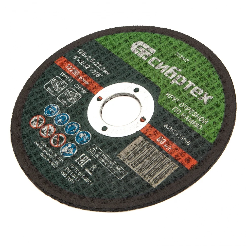 Отрезной круг по камню Сибртех 743667, 125 х 2,5 х 22,2 мм, используется в качестве оснастки на УШМ для сухого реза камня, огнеупорного кирпича, бетонных изделий, керамической плитки. Высокая производительность позволяет использовать круг как в быту, так и в частной мастерской или на небольших производствах.ПреимуществаАбразивные зерна из карбида кремния имеют острые грани и легко справляются с резкой твердых материалов.Двухслойная усиленная стеклосетка придает кругу прочность на разрыв, что повышает безопасность работы.Бакелитовая связка с упрочняющими элементами обеспечивает максимальную износостойкость круга.Круг быстро режет материалы, позволяя получить аккуратный срез.Круг отличается превосходным качеством, т.к. изготовлен на высокотехнологичном оборудовании квалифицированным персоналом.