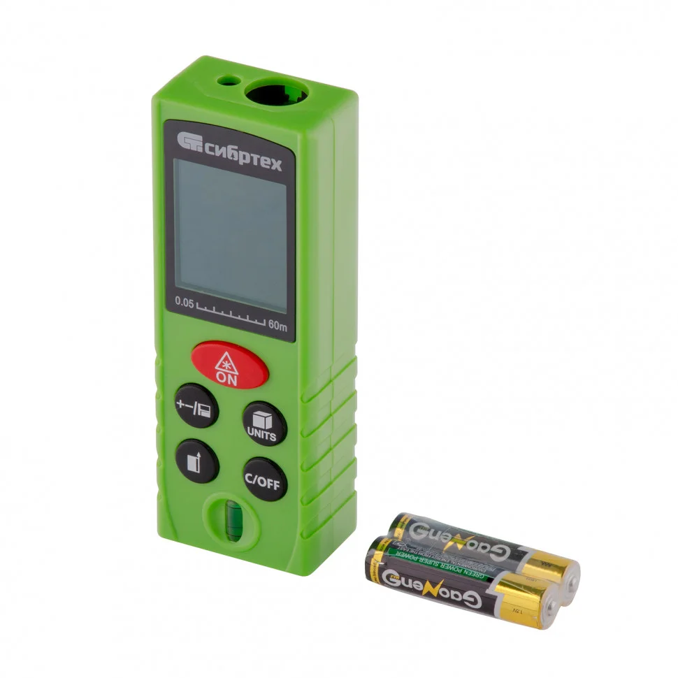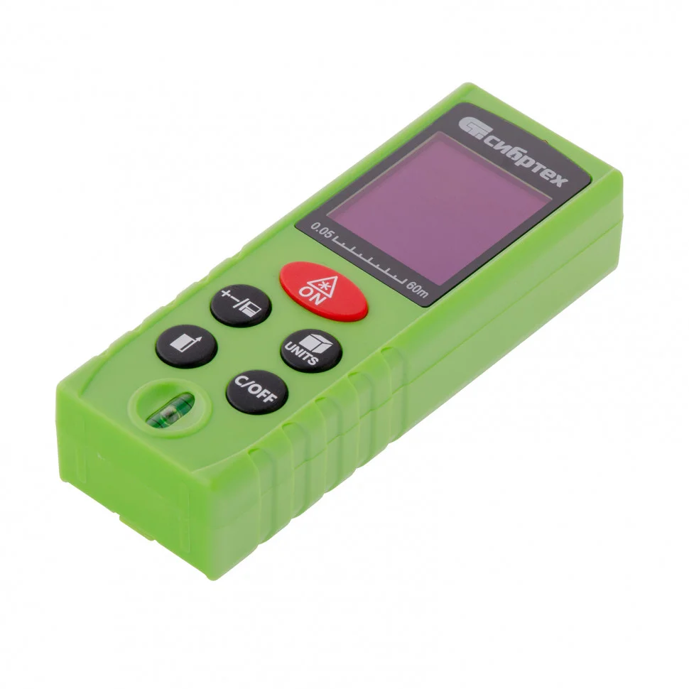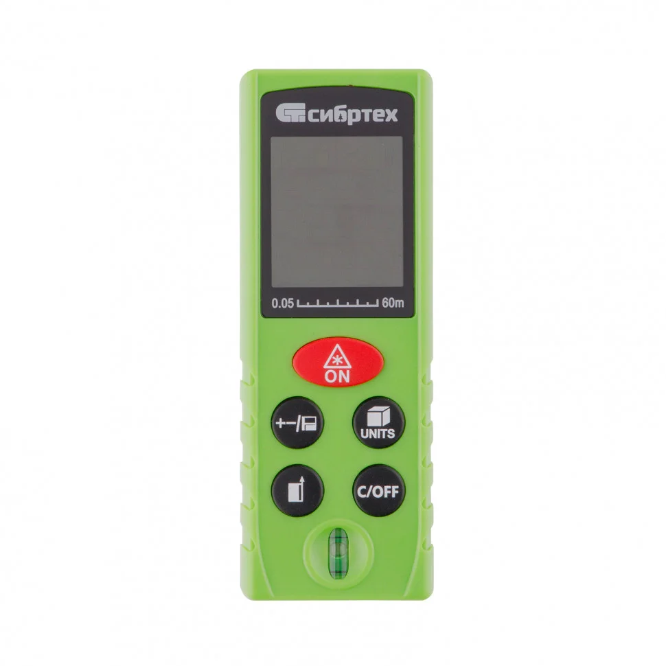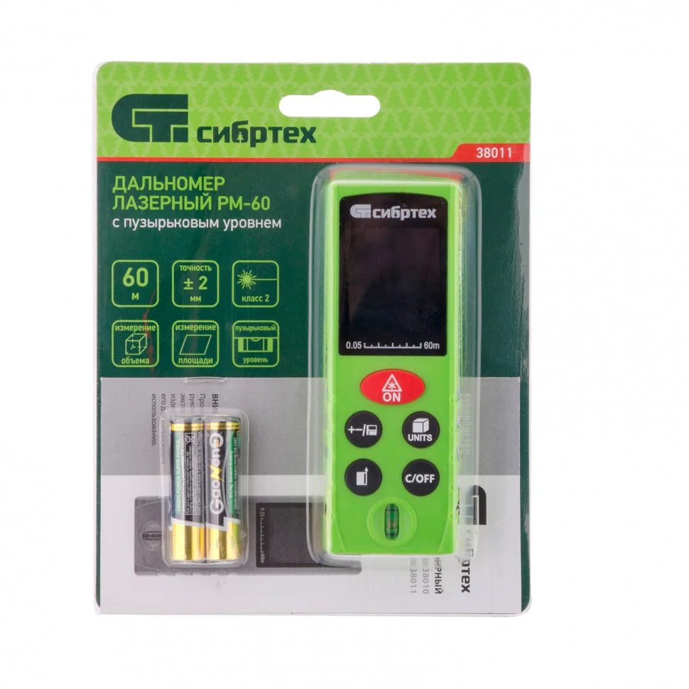 Лазерный дальномер Сибртех РМ-60 38011 с пузырьковым уровнем отличается высокой дальностью измерения до 60 м и помогает определять длину, объем и площадь помещения, а также складывать и вычитать полученные результаты. Он применяется при проведении строительных и отделочных работ: укладке плитки, установке окон, дверей, напольных покрытий, натяжных потолков. Будет полезен также для проведения дорожных и геодезических работ.ПреимуществаНадежность — корпус из прочного пластика устойчив к механическим повреждениям.Функция вычислений по теореме Пифагора — можно измерить расстояние даже при отсутствии отражающей поверхности.Встроенная память — прибор способен сохранять результаты 20 замеров, а значит, не нужно записывать полученные данные.Опция непрерывных измерений — замеры производятся каждую секунду, что удобно для определения максимального и минимального расстояния от точки отсчета.Встроенный пузырьковый уровень — удобно контролировать положение дальномера для повышения точности измерений.Низкое энергопотребление — заряда 2 батареек типа AAA хватает на 1000 замеров, а через 150 с бездействия прибор автоматически отключается.