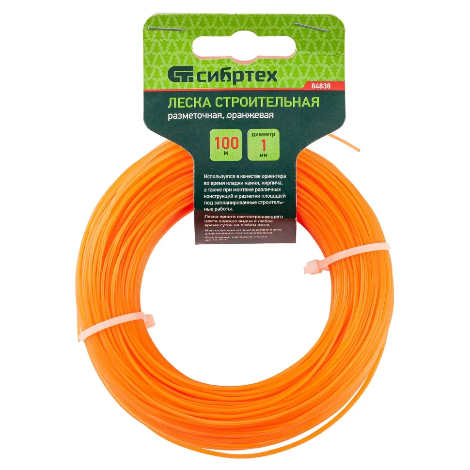 Леска строительная Сибртех 84838, длина 100 м, диаметр 1 мм, оранжевого цвета, пригодится на строительной площадке как ориентир при укладке материалов, установке конструкций. Также она будет полезна для садоводов для разметки территории. Если леску натянуть, то получается идеально ровная линия, что повышает точность работы, а также позволяет проводить замеры с ее помощью.ПреимуществаЛеска выполнена из высокопрочного и эластичного полипропилена, поэтому не растягивается, не загрязняется, а также выдерживает разрывные нагрузки до 15 КГС.Оранжевая светоотражающая леска хорошо видна даже в темное время суток.100 м лески хватит на большой объем работ.