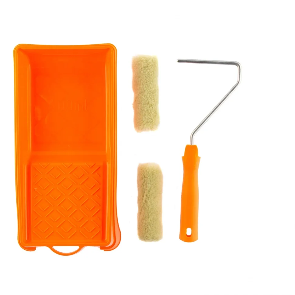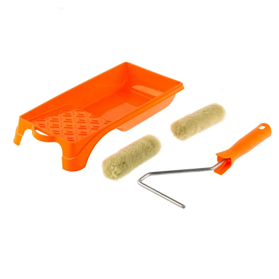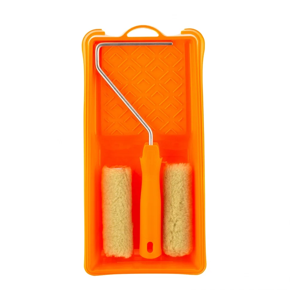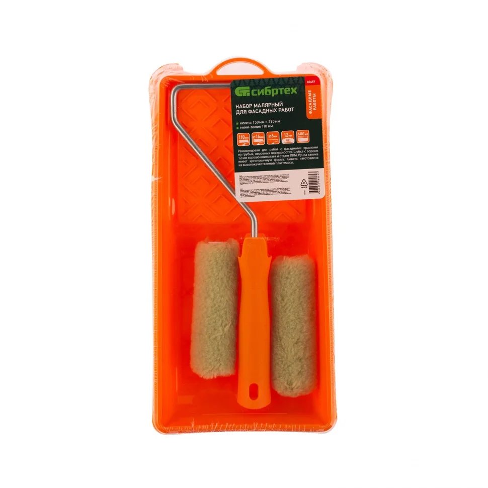 Малярный набор для фасадных работ Сибртех 80457 с двумя сменными мини-валиками шириной 110 мм, кюветой 150 мм х 290 мм и бюгелем в комплекте используется для окрашивания грубых и неровных поверхностей. Шубки изготовлены из полиакрила и полиэстера, поэтому устойчивы к разрыву, отлично держат форму, обладают хорошей впитываемостью и отдачей ЛКМ.ПреимуществаУдобное окрашивание небольших поверхностей — мини-валики имеют ширину 110 мм, поэтому подходят даже для труднодоступных участков.Прочная кювета — она выполнена из высококачественной пластмассы и устойчива к механическим нагрузкам.Экономный расход лакокрасочных материалов — благодаря специальной конструкции кюветы излишки краски стекают в ванночку, а не скапливаются на раскаточной доске.Комфортная эксплуатация — эргономичная рукоятка бюгеля обеспечивает удобный захват, что снижает усталость мастера во время длительной работы.
