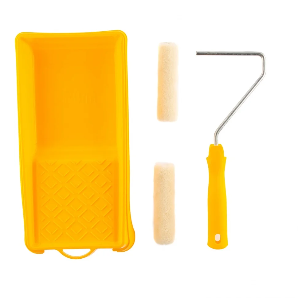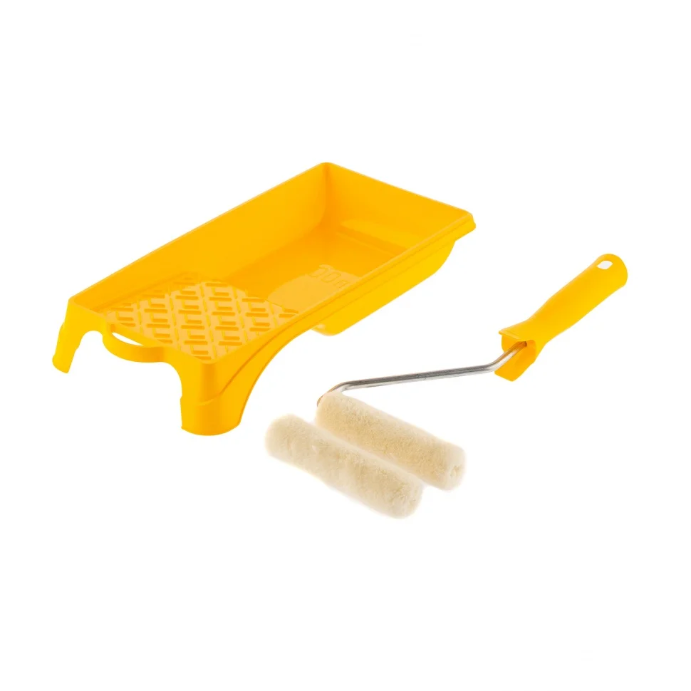 Малярный набор для работ с лаками Сибртех 80458 состоит из двух сменных мини-валиков шириной 110 мм, кюветы размером 150 мм х 290 мм и бюгеля. Валики позволяют наносить лак идеально ровным и тонким слоем, создавая гладкое финишное покрытие. Шубки с коротким плотным ворсом обеспечивают высокое качество окрашивания без ворсинок на поверхности.ПреимуществаУдобное окрашивание небольших поверхностей — мини-валики имеют ширину 110 мм, поэтому подходят даже для труднодоступных участков.Прочная кювета — она выполнена из высококачественной пластмассы и устойчива к механическим нагрузкам.Экономный расход лакокрасочных материалов — благодаря специальной конструкции кюветы излишки краски стекают в ванночку, а не скапливаются на раскаточной доске.Комфортная эксплуатация — эргономичная рукоятка бюгеля обеспечивает удобный захват, что снижает усталость мастера во время длительной работы.