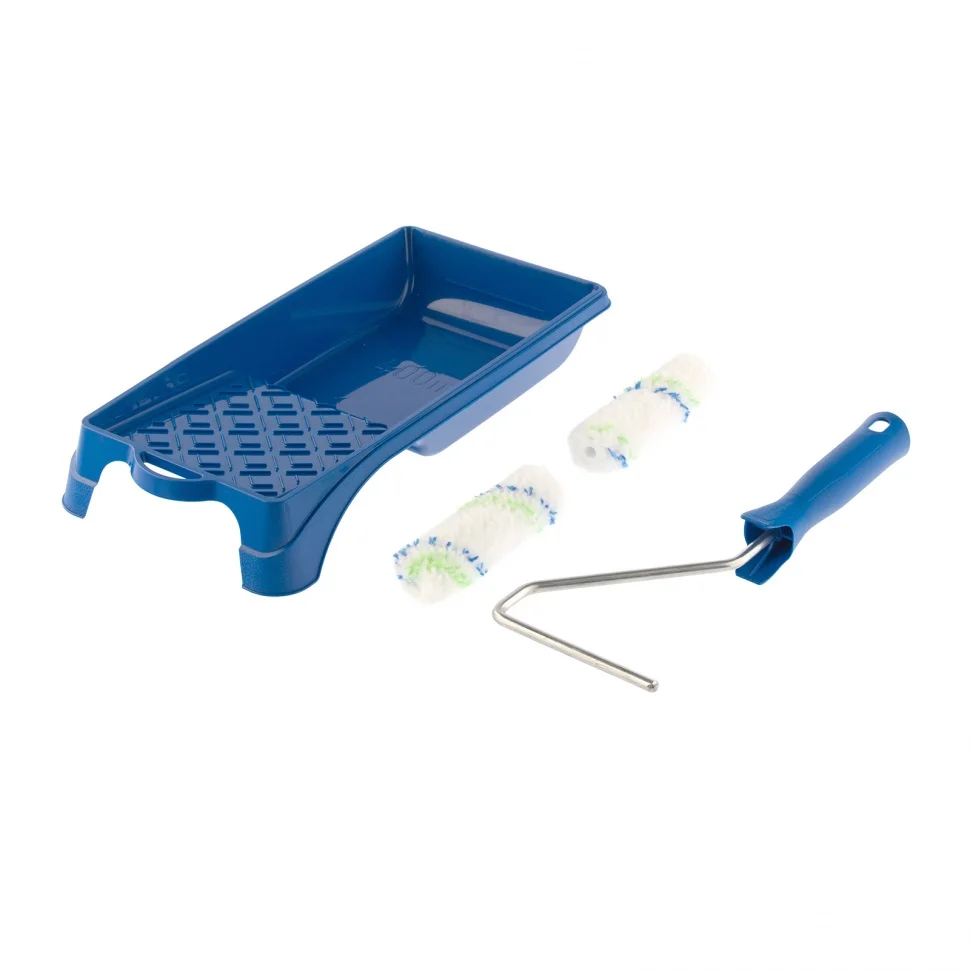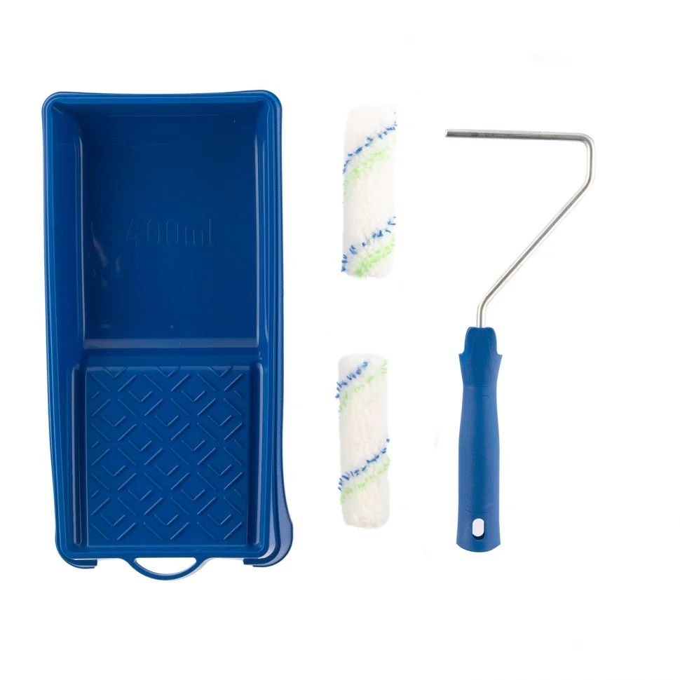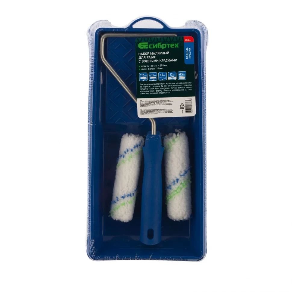 Малярный набор для работ с водными красками Сибртех 80456 включает в себя 2 сменных мини-валика шириной 110 мм, бюгель и кювету размером 150 мм х 290 мм. Используется для нанесения ЛКМ на водной основе при выполнении общемалярных работ. Универсальные валики с ворсом 12 мм подходят для поверхностей любого типа. Шубки из полиэстера не оставляют ворсинок на окрашиваемой поверхности, хорошо впитывают и отдают лакокрасочные материалы.ПреимуществаУдобное окрашивание небольших поверхностей — мини-валики имеют ширину 110 мм, поэтому подходят даже для труднодоступных участков.Прочная кювета — она выполнена из высококачественной пластмассы и устойчива к механическим нагрузкам.Экономный расход лакокрасочных материалов — благодаря специальной конструкции кюветы излишки краски стекают в ванночку, а не скапливаются на раскаточной доске.Комфортная эксплуатация — эргономичная рукоятка бюгеля обеспечивает удобный захват, что снижает усталость мастера во время длительной работы.