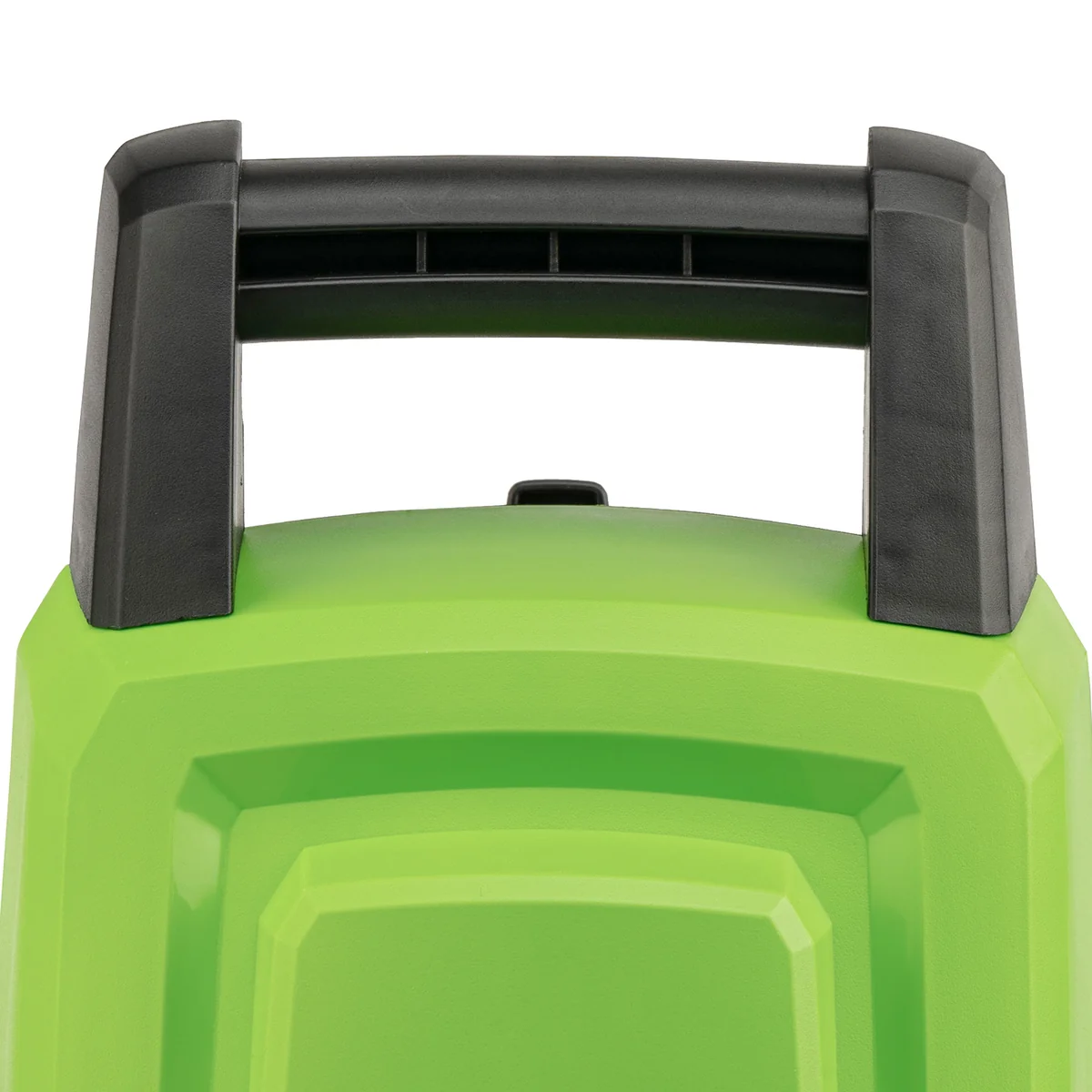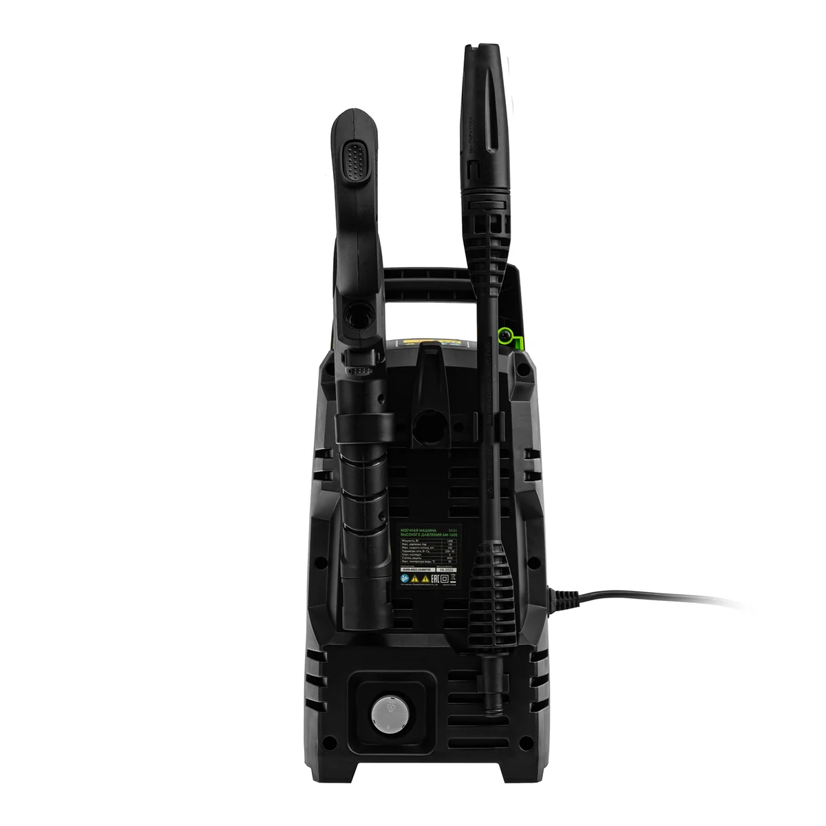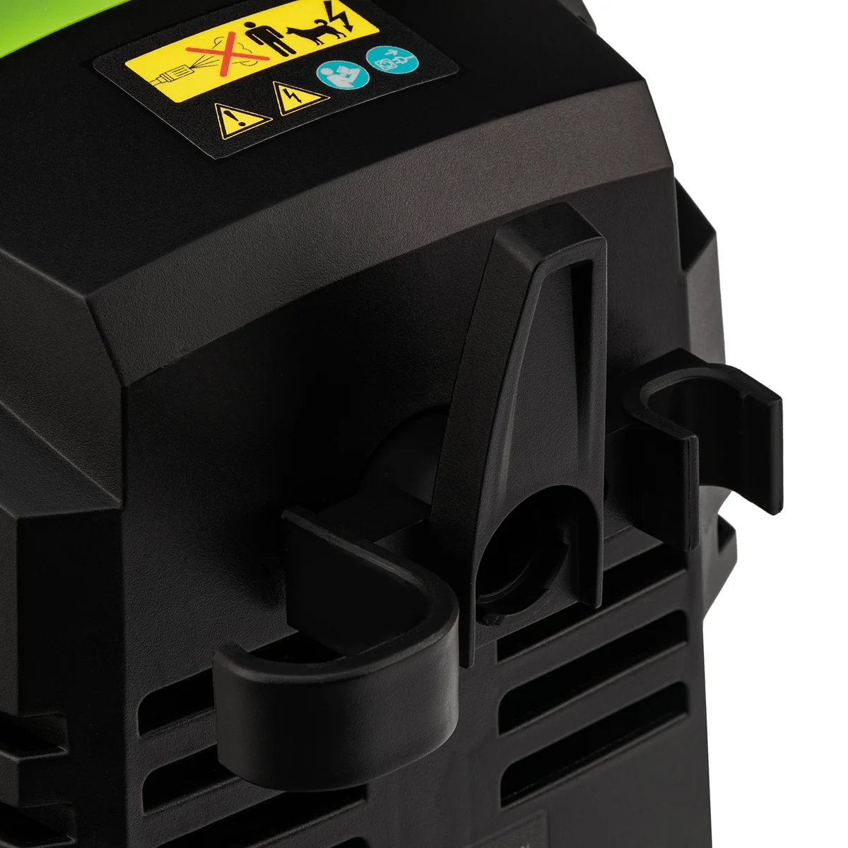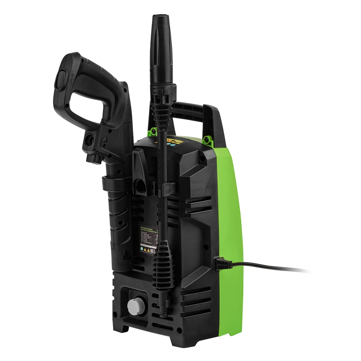 - Продуманное хранение и транспортировка — на корпусе имеется удобная ручка, для кабеля и шланга предусмотрены специальные кронштейны.
