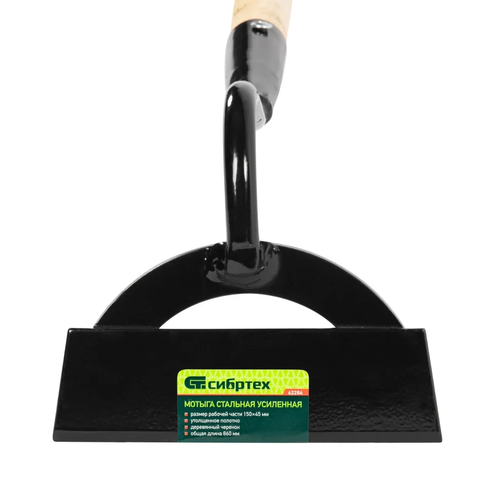 Стальная усиленная мотыга Сибртех 62284, 150 х 45 х 860 мм, с деревянным черенком, — ручной инструмент для рыхления и прополки почвы, окучивания растений. Поставляется в сборе со шлифованным черенком из древесины твердых пород, обеспечивающим комфорт во время работы. Длина черенка 860 мм, поэтому мотыга очень удобна для работы в тесном пространстве, например, в парнике или теплице. Инструмент будет полезен владельцам дачных участков.ПреимуществаДолговечность — полотно изготовлено из прочной среднеуглеродистой стали толщиной 2,5 мм, устойчивой к деформациям.Коррозионная стойкость — на полотно нанесено защитное покрытие из порошковой эмали.Надежность — благодаря сварному креплению полотно не отскочит от тулейки во время работы.Крепкое соединение — черенок зафиксирован в тулейке саморезом.