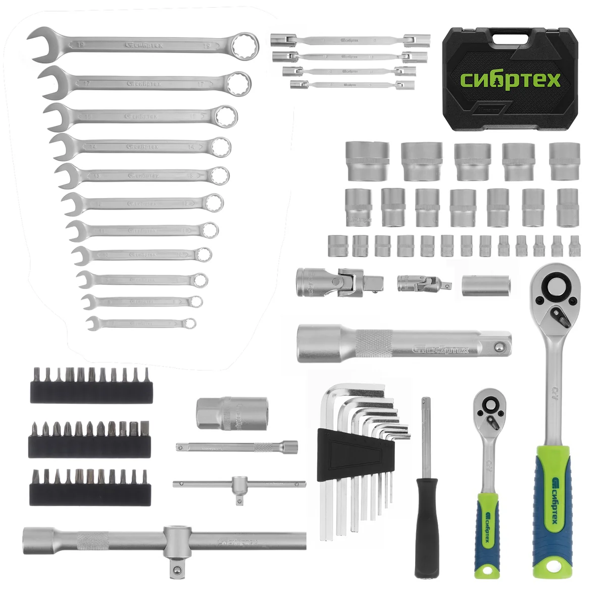 Набор инструментов Сибртех 13396 упакован в пластиковый кейс и состоит из 89 предметов с присоединительным размером 1/2"" и 1/4"", предназначенных для монтажа и демонтажа резьбового крепежа с разными типами шлицев. В комплект поставки входят карданы, удлинители и шарнирные ключи, облегчающие работу в труднодоступных местах. Набор используется для ремонта автомобилей, а также полезен в быту.