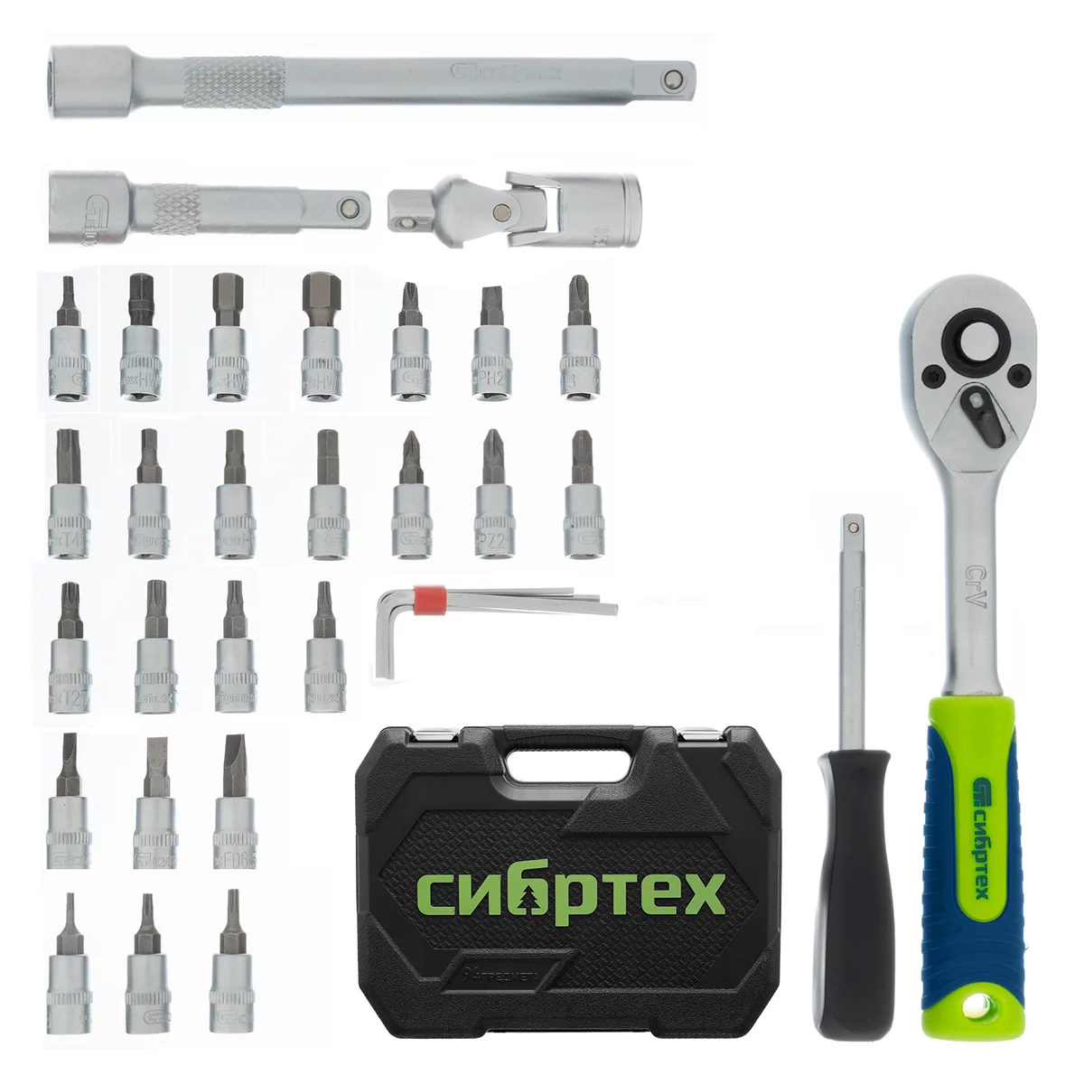Набор инструментов Сибртех 13399, поставляющийся в пластиковом кейсе, состоит из 56 предметов с присоединительным размером 1/4"", предназначенных для закручивания и откручивания резьбового крепежа. В комплект поставки входят 2 удлинителя и кардан, облегчающие работу в труднодоступных местах. Набор будет полезен для ремонта автомобиля в гараже, пригодится также и в быту.