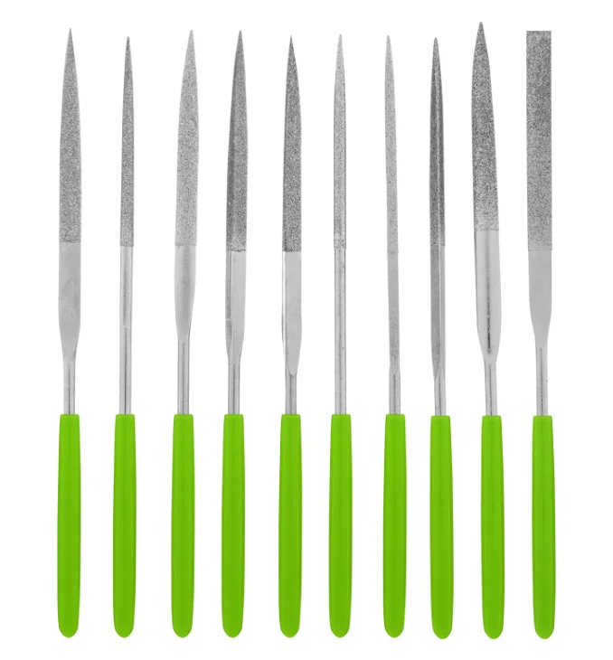 - Надфили с яркими рукоятками хорошо заметны среди других инструментов, поэтому не затеряются в рабочем пространстве.