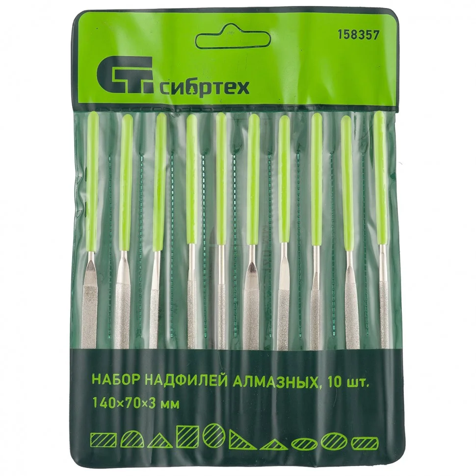 Набор алмазных надфилей Сибртех 158357 из 10 шт., 140 х 70 х 3 мм, предназначен для опиливания твердых поверхностей — стекла, металла, камня, керамики. В комплекте надфили с самыми распространенными профилями, благодаря чему можно обрабатывать плоские детали, пазы, углы, отверстия, сложные грани и рельефные поверхности. Набор будет полезен при проведении слесарных или ремонтно-отделочных работ, пригодится и в быту.ПреимуществаАлмазная крошка, являющаяся абразивом, характеризуется высокой твердостью, что увеличивает ресурс надфилей.Обрезиненные рукоятки не выскальзывают из ладони, что обеспечивает комфорт во время работы.Надфили с яркими рукоятками хорошо заметны среди других инструментов, поэтому не затеряются в рабочем пространстве.
