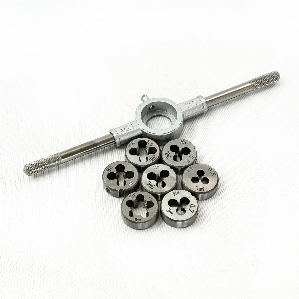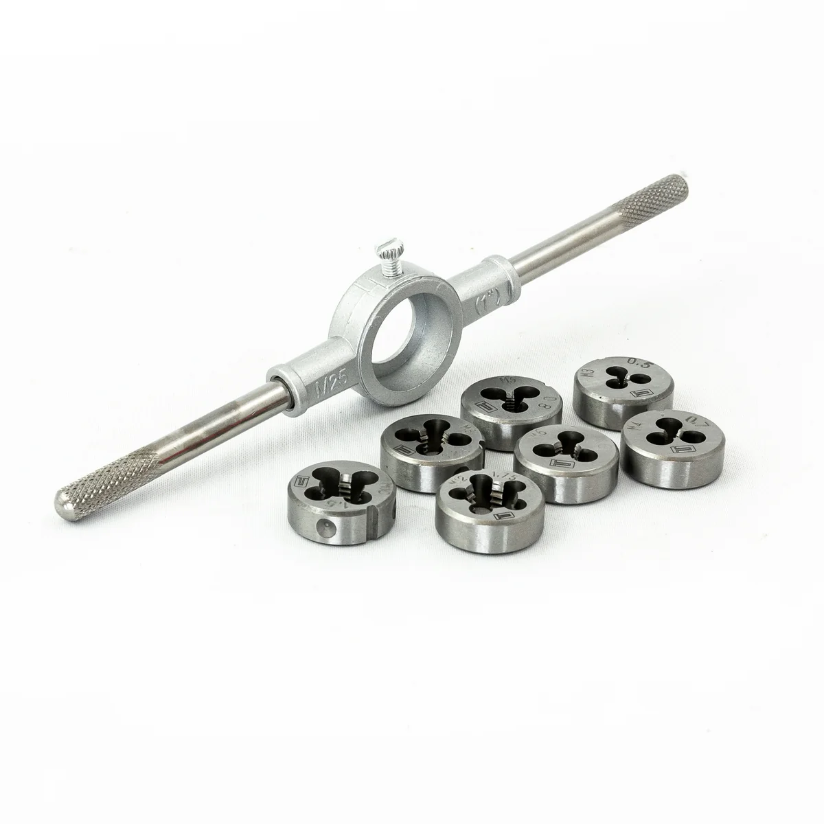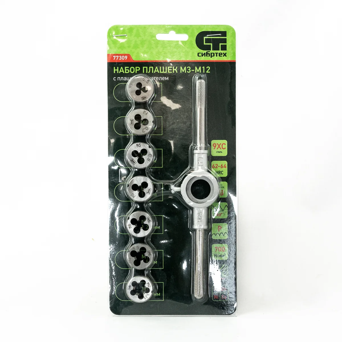 Набор плашек Сибртех 77309, М3-М12, 8 предметов, применяется для нарезания внешней резьбы. Он рассчитан на работу с металлическими и стальными изделиями с пределом прочности 800 Н/мм2. Набор пригодится мастерам для скрепления различных деталей при проведении ремонта авто, бытовой техники, строительных работ.ПреимуществаНадежный и долговечный набор — плашки выполнены из легированной инструментальной стали 9XC и закалены до твердости 59-62 HRC.Удобная работа — на плашки нанесена маркировка с обозначением размера (М3-М12) и шага резьбы.Прочная фиксация и центровка плашек — плашкодержатель в комплекте оснащен стопорными винтами.
