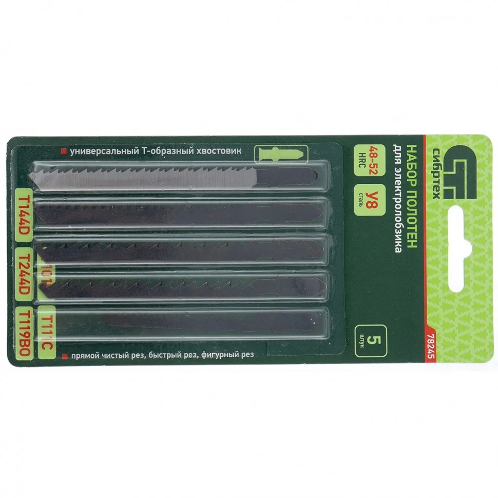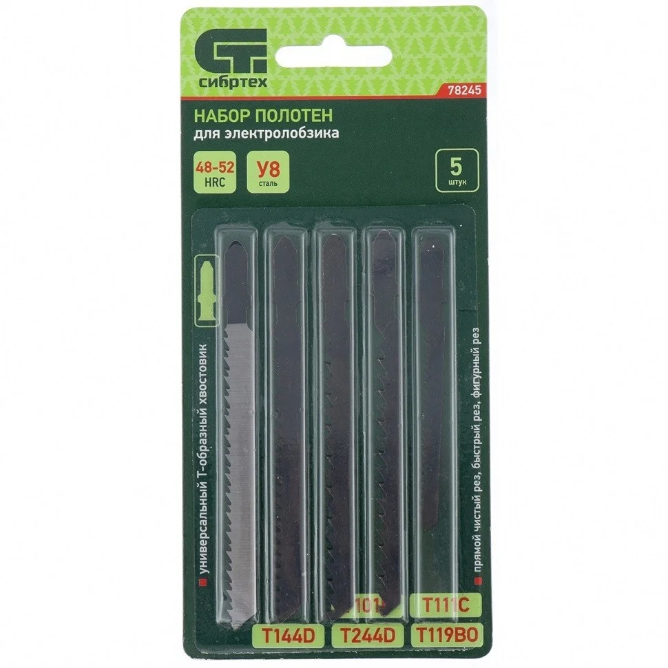 Набор полотен по дереву Сибртех 78245, 5 шт., с универсальным Т-образным хвостовиком подходит для большинства типов электролобзиков. С его помощью можно осуществлять фигурный, прямой чистый и быстрый рез по дереву. Набор рассчитан на бытовое использование в частных мастерских, гараже, дома.ПреимуществаВысокоуглеродистая сталь У8 твердостью 48-52 HRC, из которой изготовлены полотна, гарантирует их высокий ресурс.Удобная упаковка позволяет компактно хранить полотна, а также защищает их от коррозии.Универсальный набор включает в себя полотна самых распространенных типов T101B, T111C, T144D, T244D, T119BO.
