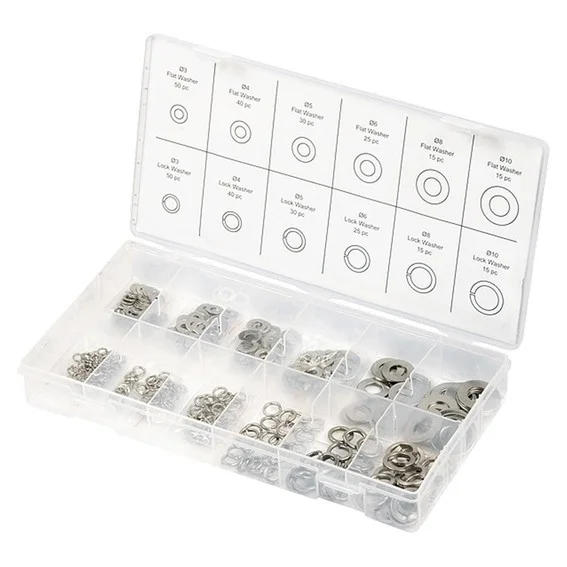 Набор плоских шайб и гроверов Сибртех 47614 состоит из 350 предметов размером 3, 4, 5, 6, 8 и 10 мм. Они служат для усиления резьбовых соединений и предотвращения их раскручивания. Набор будет полезен в строительстве, при сборке мебели, бытовой техники и электроники, пригодится также и в домашнем хозяйстве.ПреимуществаВсе метизы изготовлены из стали, чем обусловлена их прочность, устойчивость к нагрузкам, а также надежность образуемых ими соединений.На шайбы нанесено цинковое покрытие, повышающее коррозионную стойкость крепежа.В наборе гайки и шайбы самых популярных размеров, что обеспечивает широкие возможности для его применения.Крепежные элементы упакованы в пластиковый кейс и рассортированы по отделениями в соответствии с размером, благодаря чему очень удобны в хранении и использовании.