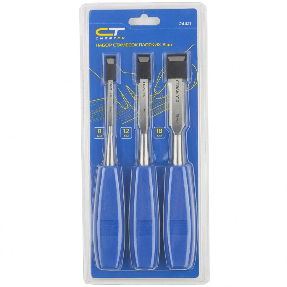 Набор Сибртех 24421 из 3 плоских стамесок с шириной режущей части 8-12-18 мм помогает производить выборку и зачистку углублений, снимать фаски, обрабатывать шипы и проушины в размер, отделять стружку, а также решать другие столярные задачи. Инструменты позволяют получать прямоугольные пазы разной ширины и используются для работ по массиву натурального дерева.ПреимуществаПрочность — полотна стамесок выполнены из высокотвердой конструкционной углеродистой стали 55.Износостойкость — рабочие полотна закалены до твердости 57 HRC на 0,7 длины и заточены под углом 20-35 градусов, поэтому повторная заточка потребуется минимум через 6-12 месяцев.Эргономичность — рукоятки из ударопрочного пластика удобно ложатся в руку, что позволяет долго работать без усталости.