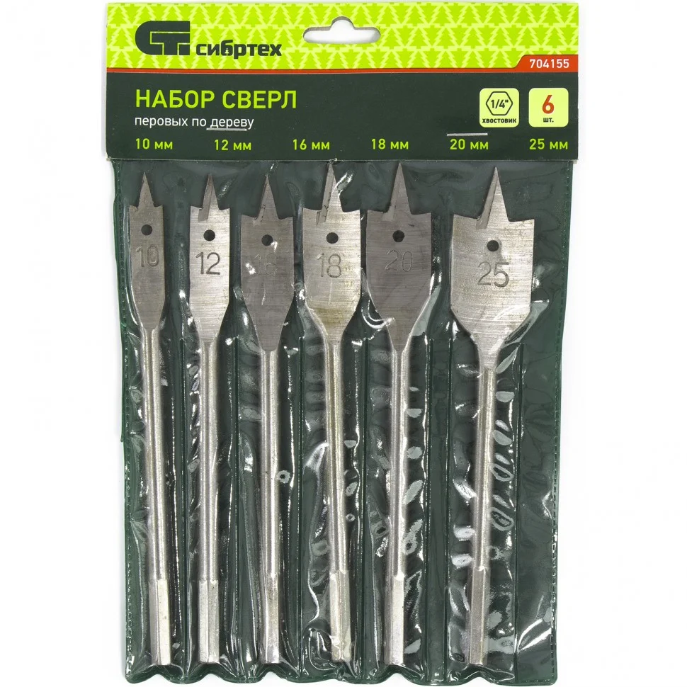 Набор Сибртех 704155 состоит из 6 перовых сверл по дереву размером 10-12-16-18-20-25 мм, с 6-гранным хвостовиком, используемых для получения глубоких сквозных отверстий в древесине. Ими также можно сверлить глухие отверстия, если нет строгих требований к форме их дна. Точное позиционирование сверл обеспечивают центральные шипы. Набор включает инструменты самых распространенных размеров и пригодится для сборки деревянных конструкций.ПреимуществаПрочность — сверла изготовлены из инструментальной стали 45 и устойчивы к динамическим нагрузкам.Износостойкость — рабочие кромки сверл твердостью 45-54 HRC долго сохраняют режущую способность.Надежная фиксация — сверла имеют 6-гранные хвостовики, поэтому не проворачиваются в патроне.
