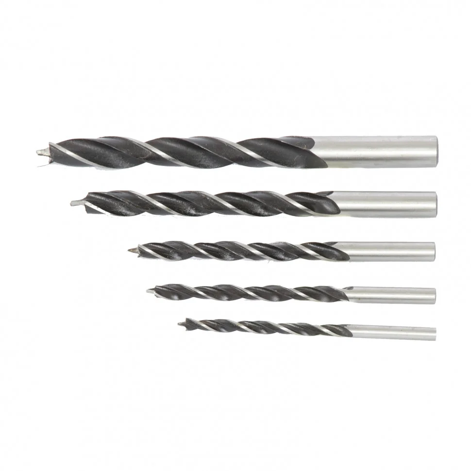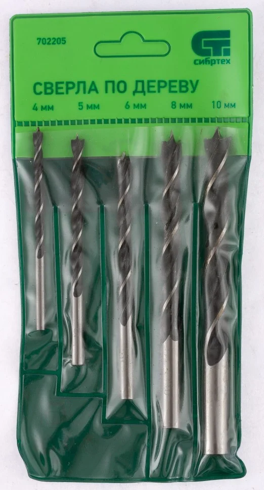 Набор сверл по дереву Сибртех 702205 состоит из 5 режущих инструментов диаметром 4-5-6-8-10 мм, с цилиндрическим хвостовиком, предназначенных для получения отверстий в древесине. Они имеют центрирующие острия, которые облегчают засверливание и не позволяют сверлам отклоняться от заданной оси. Набор будет полезен в столярной мастерской, пригодится во время сборки мебели, а также дома или на даче.ПреимуществаВходящие в набор сверла изготовлены из инструментальной стали 45, поэтому устойчивы к динамическим нагрузкам.Рабочие части закалены, а твердость режущих кромок составляет 40 HRC, что обеспечивает износостойкость сверл.Благодаря спиральным канавкам стружка своевременно удаляется из отверстия, что предотвращает застревание сверла в отверстии.Хвостовики имеют цилиндрическую форму и совместимы со стандартным патроном дрели.
