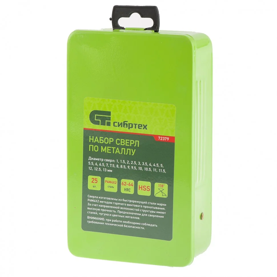 Набор сверл по металлу Сибртех 72379 диаметром 1-13 мм (через 0,5 мм), из стали HSS, с цилиндрическим хвостовиком, состоит из 25 шт. и упакован в металлическую коробку. Используется для получения отверстий в черных металлах, в том числе стали и чугуне. Большой выбор оснасток позволяет точно подобрать необходимый размер. Набор поставляется в надежном металлическом боксе и пригодится во время строительства и ремонта, а также будет полезен для бытовых работ.ПреимуществаПрочность — сверла изготовлены из быстрорежущей стали, устойчивой к механическому воздействию и перегреву.Высокий ресурс работоспособности — режущие кромки твердостью 62-64 HRC долго держат заточку.Универсальность — сверла с цилиндрическими хвостовиками совместимы со всеми типами патронов.Улучшенный отвод стружки — поверхность оснасток отполирована, что уменьшает их трение о стенки отверстий.Защита от заклинивания — диаметр направляющей части сверл уменьшается по направлению к хвостовику.Быстрый выбор оснастки — сверла помещены в гнезда с обозначениями размеров.