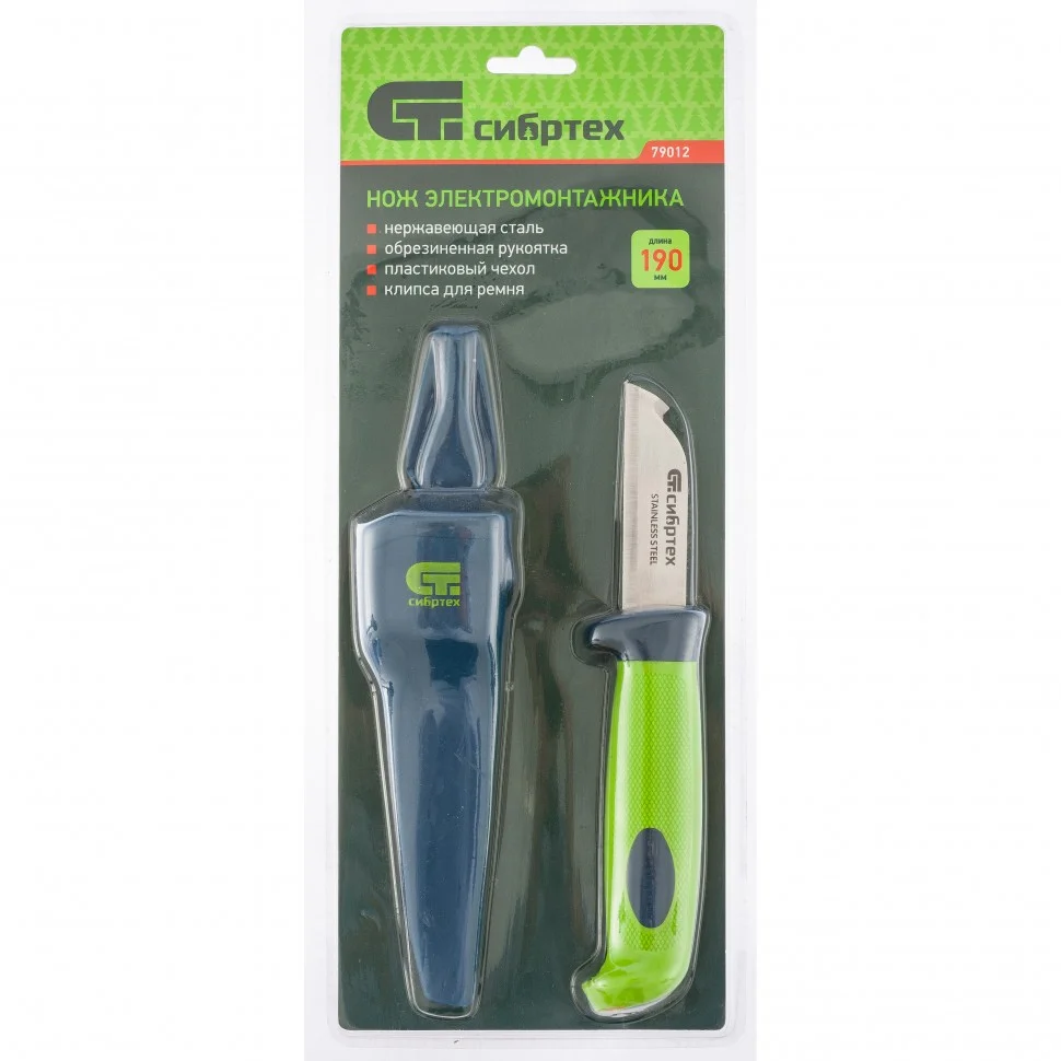 Нож монтажника с чехлом, обрезиненная рукоятка, 190 мм, лезвие 67 мм Сибртех 79012