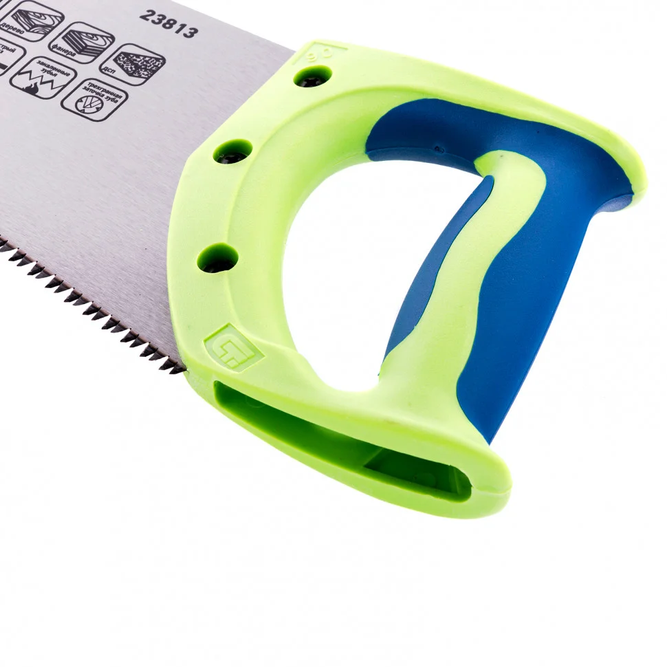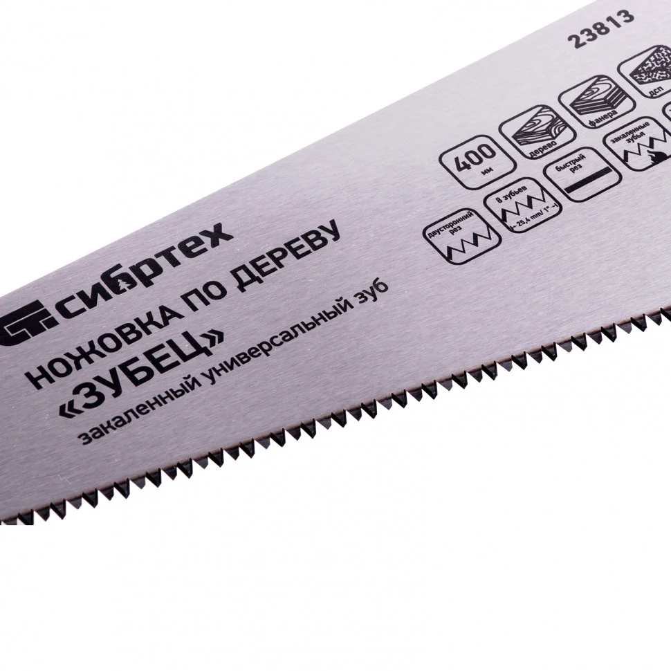 Ножовка Сибртех по дереву «Зубец» 23813 с полотном длиной 400 мм, калеными зубьями с 3D-заточкой и шагом 7-8 TPI, 2-компонентной рукояткой, предназначена для продольной и поперечной распиловки древесины, фанеры и ДСП. Инструмент обладает высокой производительностью благодаря зубьям с универсальным шагом 7-8 TPI и трехгранной заточке. Ножовка используется для выполнения столярных и плотницких работ, будет полезна в быту.ПреимуществаПолотно изготовлено из легированной стали 65Mn, чем обусловлена его прочность и устойчивость к деформациям.Зубья ножовки закалены, что обеспечивает ей высокий ресурс работоспособности.Поверхность полотна покрыта лаком для защиты от коррозии.Рукоятка закреплена на полотне 3 винтами, поэтому не соскочит во время работы.Материал двухкомпонентной рукоятки — ударопрочный ABS-пластик, обеспечивающий надежность инструмента.Эргономичная рукоятка удобно лежит в руке, что повышает комфортность работы.