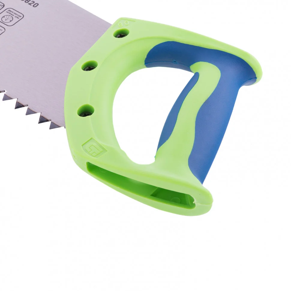 Ножовка по дереву Сибртех «Зубец» 23820 с полотном длиной 400 м, калеными зубьями с шагом 10 мм и 2D-заточкой, 2-компонентной рукояткой, используется для продольного и поперечного пиления древесины и ДСП. Рабочая кромка с шагом зубьев 10 мм обеспечивает быстрый рез. Зубья имеют 2D-заточку, благодаря чему ножовкой можно пилить в направлении как от себя, так и на себя. Возможна заточка режущей части. Ножовка применяется для выполнения плотницких работ, пригодится также и в быту.ПреимуществаПолотно изготовлено из легированной стали 65Mn, чем обусловлена его прочность и устойчивость к деформациям.Зубья ножовки закалены, что обеспечивает ей высокий ресурс работоспособности.Поверхность полотна покрыта лаком для защиты от коррозии.Рукоятка закреплена на полотне 3 винтами, поэтому не соскочит во время работы.Материал двухкомпонентной рукоятки — ударопрочный ABS-пластик, обеспечивающий надежность инструмента.Эргономичная рукоятка удобно лежит в руке, что повышает комфортность работы.