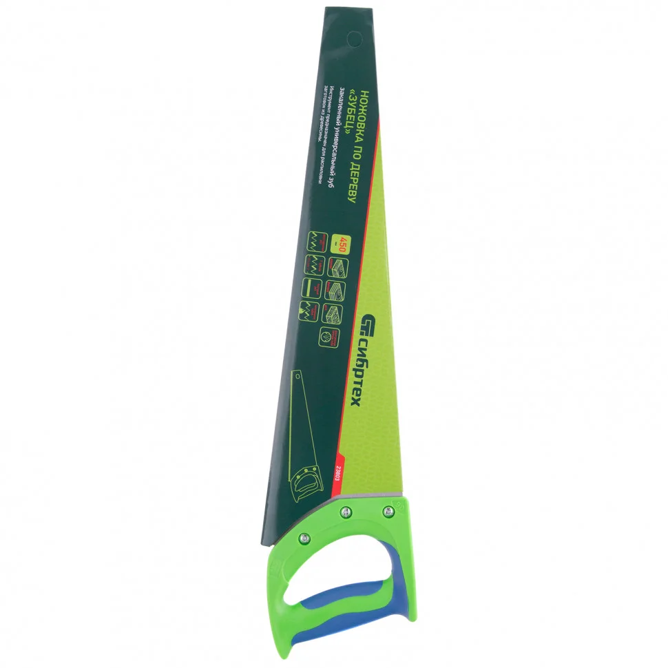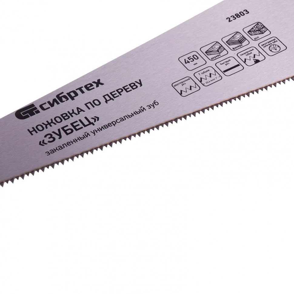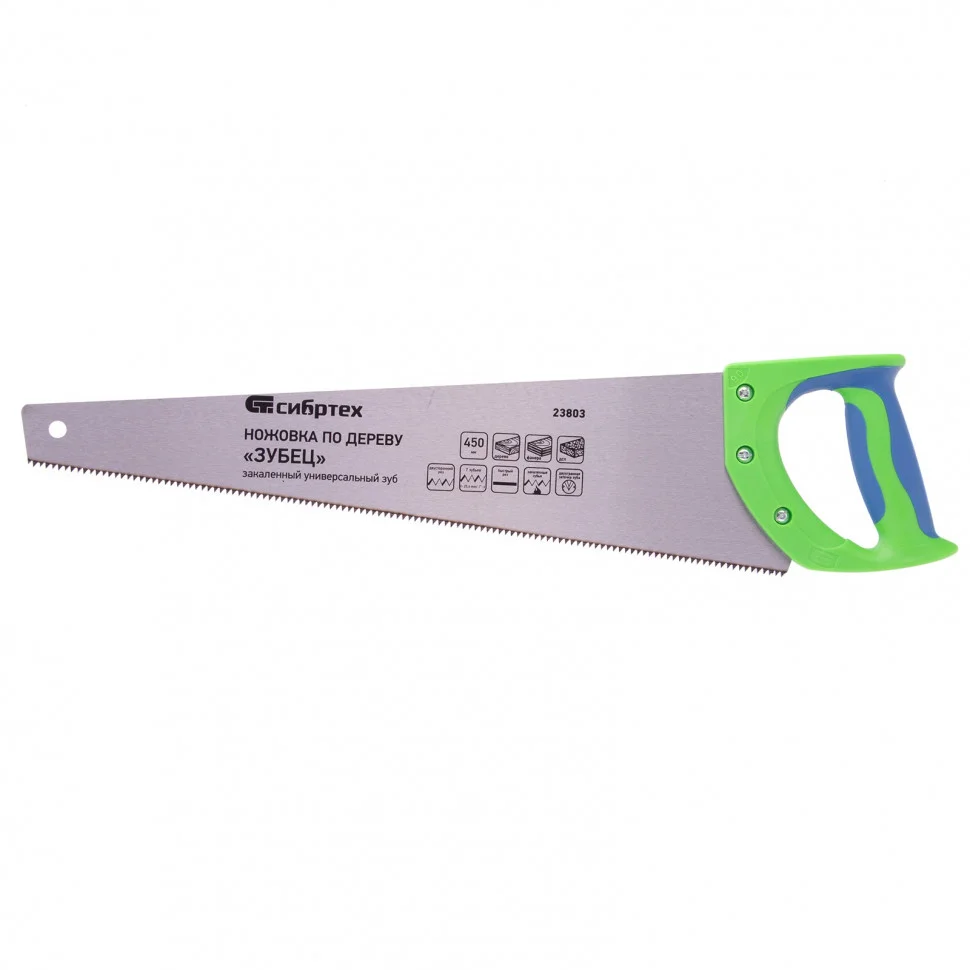Ножовка по дереву Сибртех «Зубец» 23803 с полотном длиной 450 мм, калеными зубьями с 2D-заточкой и шагом 7 TPI, 2-компонентной рукояткой, используется для распиливания заготовок из древесины, фанеры и ДСП. Рабочая часть, содержащая 7 зубьев на дюйм, обеспечивает быстрый двусторонний рез. Режущую кромку можно перетачивать. Ножовка будет полезна столярам, плотникам и домашним мастерам.ПреимуществаПолотно изготовлено из пружинной стали 65Mn, поэтому выдерживает значительные нагрузки.Зубья прошли закалку, что обеспечивает инструменту высокий ресурс работоспособности.Поверхность полотна покрыта лаком, защищающим ее от коррозии.Рукоятка из ударопрочного пластика прикреплена к полотну 3 винтами, что придает конструкции надежность.Резиновые вставки на рукоятке препятствуют выскальзыванию ее из ладони, что повышает комфортность работы.