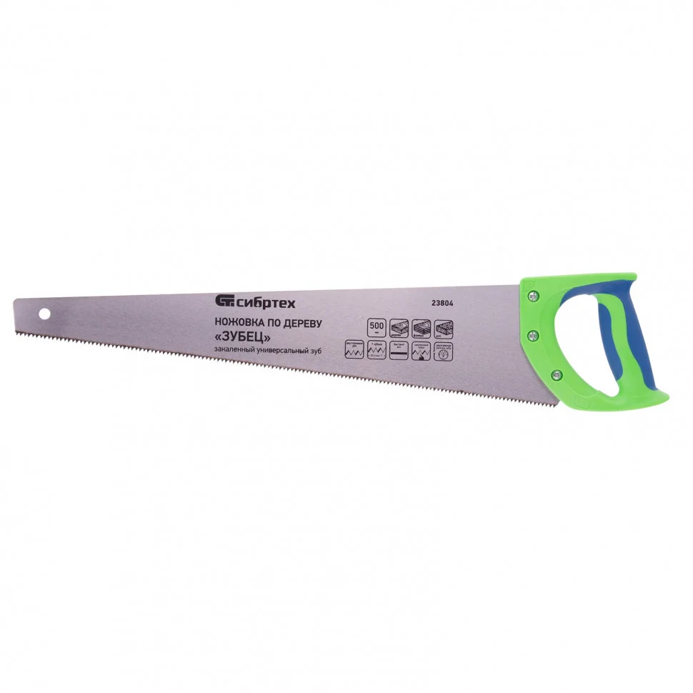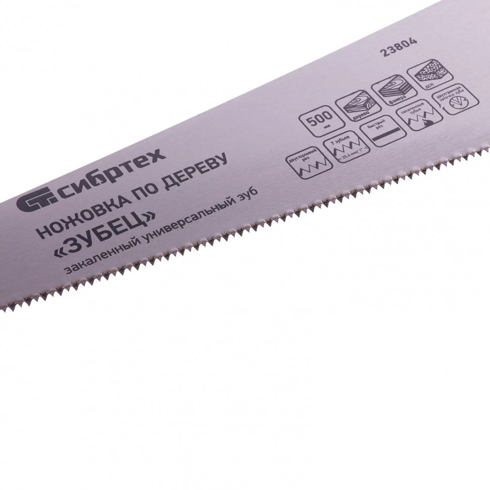Ножовка по дереву Сибртех «Зубец» 23804 с полотном длиной 500 мм, калеными зубьями с 2D-заточкой и шагом 7 TPI, 2-компонентной рукояткой, используется для распиливания заготовок из древесины, фанеры и ДСП. Рабочая часть, содержащая 7 зубьев на дюйм, обеспечивает быстрый двусторонний рез. Режущую кромку можно перетачивать. Ножовка будет полезна столярам, плотникам и домашним мастерам.ПреимуществаПолотно изготовлено из пружинной стали 65Mn, поэтому выдерживает значительные нагрузки.Зубья прошли закалку, что обеспечивает инструменту высокий ресурс работоспособности.Поверхность полотна покрыта лаком, защищающим ее от коррозии.Рукоятка из ударопрочного пластика прикреплена к полотну 3 винтами, что придает конструкции надежность.Резиновые вставки на рукоятке препятствуют выскальзыванию ее из ладони, что повышает комфортность работы.