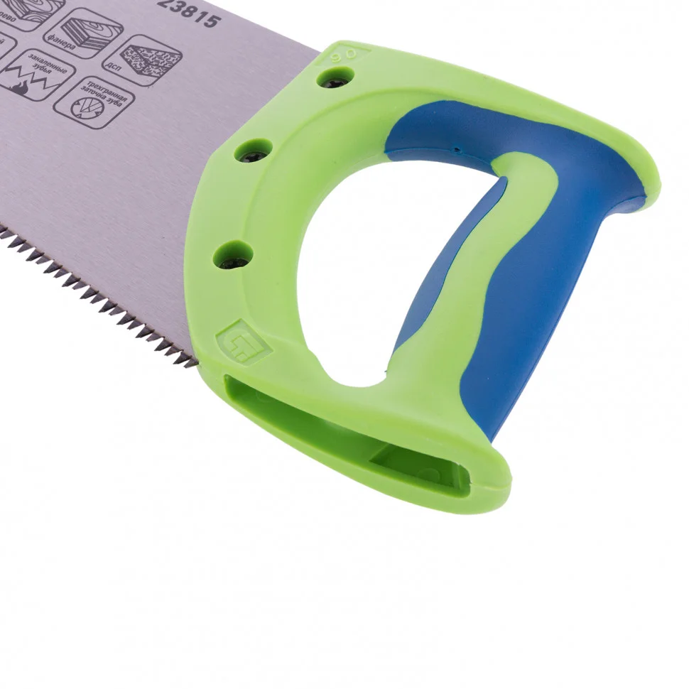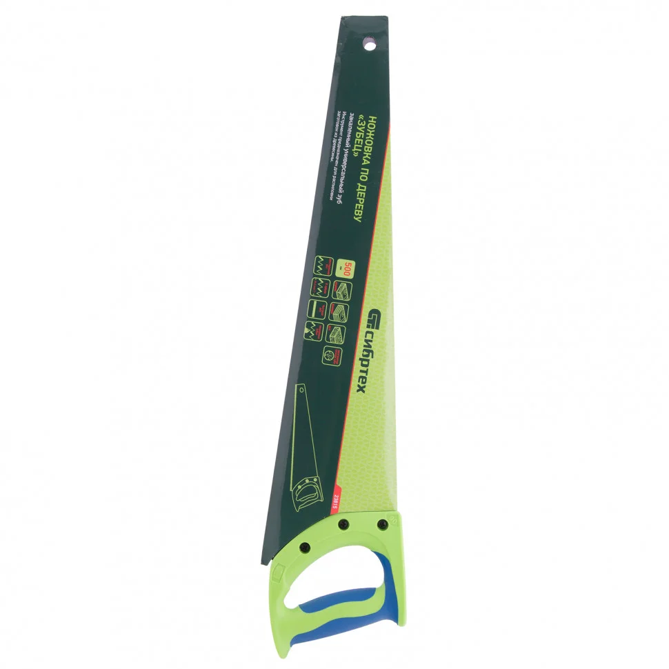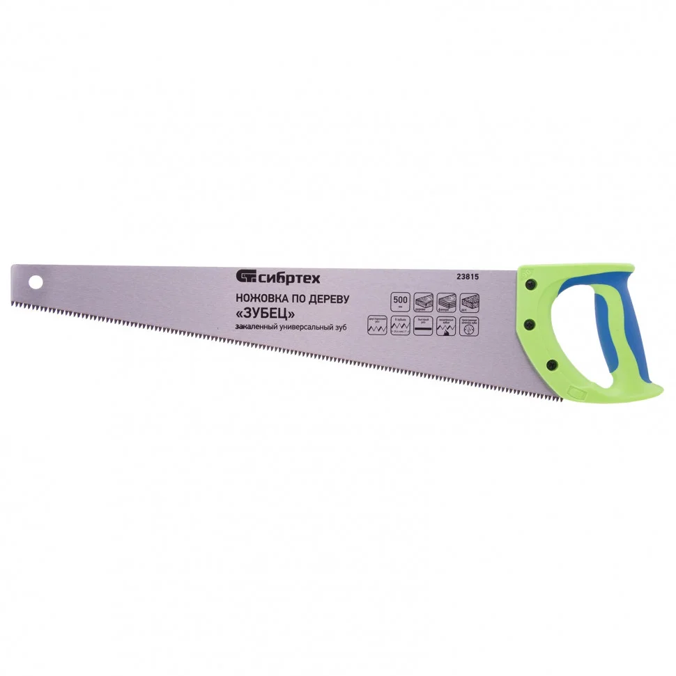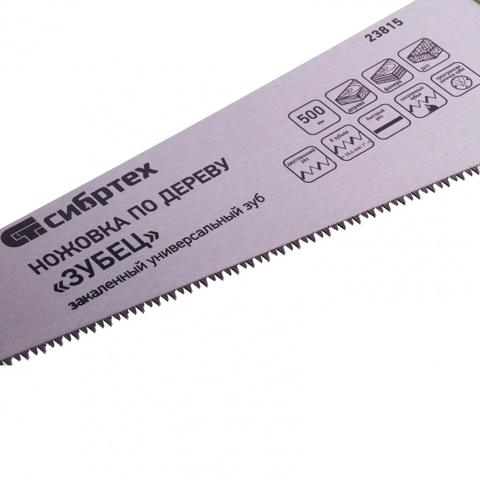 Ножовка Сибртех по дереву «Зубец» 23815 с полотном длиной 500 мм, калеными зубьями с 3D-заточкой и шагом 7-8 TPI, 2-компонентной рукояткой, предназначена для продольной и поперечной распиловки древесины, фанеры и ДСП. Инструмент обладает высокой производительностью благодаря зубьям с универсальным шагом 7-8 TPI и трехгранной заточке. Ножовка используется для выполнения столярных и плотницких работ, будет полезна в быту.ПреимуществаПолотно изготовлено из легированной стали 65Mn, чем обусловлена его прочность и устойчивость к деформациям.Зубья ножовки закалены, что обеспечивает ей высокий ресурс работоспособности.Поверхность полотна покрыта лаком для защиты от коррозии.Рукоятка закреплена на полотне 3 винтами, поэтому не соскочит во время работы.Материал двухкомпонентной рукоятки — ударопрочный ABS-пластик, обеспечивающий надежность инструмента.Эргономичная рукоятка удобно лежит в руке, что повышает комфортность работы.