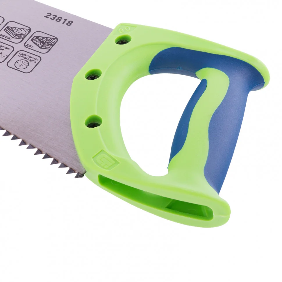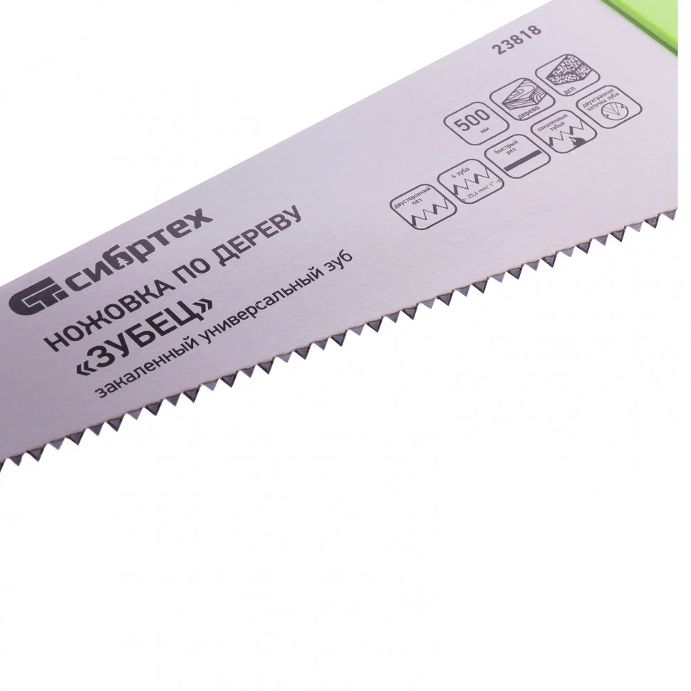 Ножовка по дереву Сибртех «Зубец» 23818 с полотном длиной 500 м, калеными зубьями с шагом 6,5 мм и 2D-заточкой, 2-компонентной рукояткой, используется для продольного и поперечного пиления древесины и ДСП. Рабочая кромка с 4 зубьями на дюйм обеспечивает быстрый рез. Зубья имеют 2D-заточку, благодаря чему ножовкой можно пилить в направлении как от себя, так и на себя. Возможна заточка режущей части. Ножовка применяется для выполнения плотницких работ, пригодится также и в быту.ПреимуществаПолотно изготовлено из легированной стали 65Mn, чем обусловлена его прочность и устойчивость к деформациям.Зубья ножовки закалены, что обеспечивает ей высокий ресурс работоспособности.Поверхность полотна покрыта лаком для защиты от коррозии.Рукоятка закреплена на полотне 3 винтами, поэтому не соскочит во время работы.Материал двухкомпонентной рукоятки — ударопрочный ABS-пластик, обеспечивающий надежность инструмента.Эргономичная рукоятка удобно лежит в руке, что повышает комфортность работы.