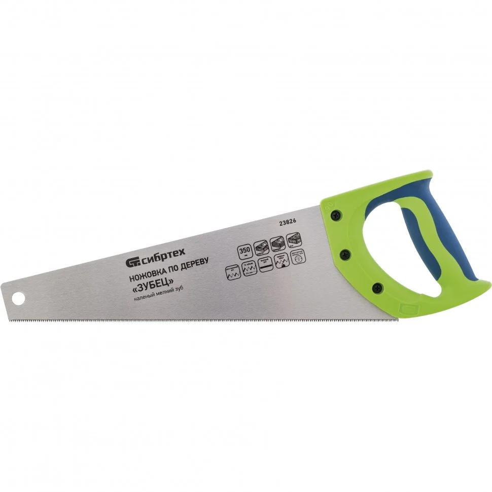 Ножовка по дереву Сибртех «Зубец» 23826 с полотном длиной 350 мм, калеными зубьями с 2D-заточкой и шагом 14 TPI, двухкомпонентной рукояткой, предназначена для точных пильных работ по древесине, фанере и ДСП. Подходит для двустороннего реза. Режущая часть с мелкими зубьями в количестве 14 на дюйм выполняет аккуратный и чистый распил. При необходимости кромку ножовки можно заточить. Инструмент будет полезен в столярной мастерской, а также пригодится в быту.ПреимуществаПрочность и долговечность — полотно изготовлено из пружинной стали 65Mn, обладающей упругостью и износостойкостью.Высокий ресурс работоспособности — зубья прошли закалку.Защита от коррозии — на полотно нанесено лаковое покрытие.Надежность — рукоятка изготовлена из ударопрочного пластика и зафиксирована на полотне при помощи 3 винтов.Комфорт во время работы — рукоятка обрезинена, поэтому не скользит в ладони и снижает нагрузку на кисть руки во время длительного пиления.