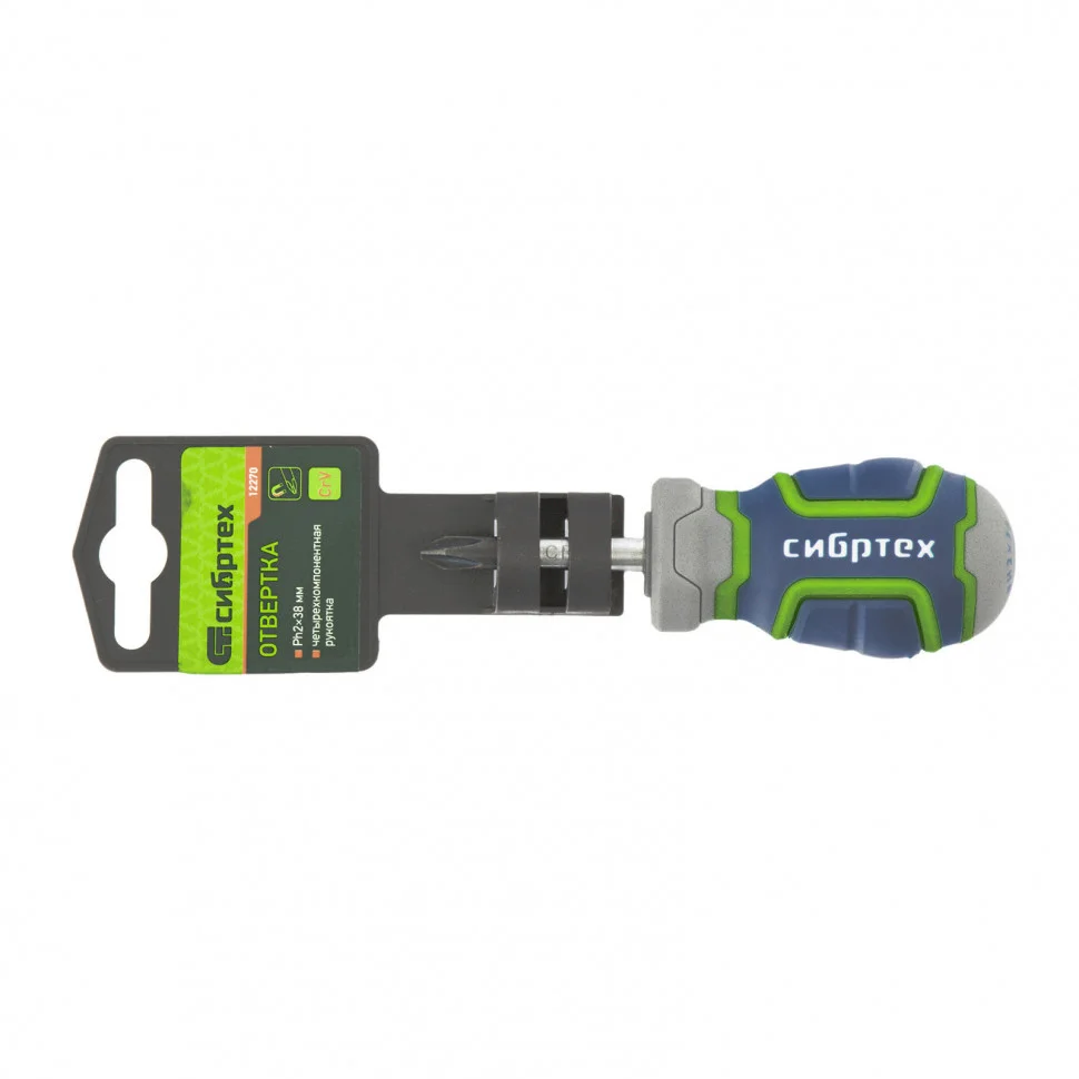 Отвертка Сибртех 12270, PH2 х 38 мм, из стали CrV, с 4-х компонентной рукояткой, имеет крестовой шлиц Philips, поэтому подходит для монтажа и извлечения крепежа соответствующего типа. Она рассчитана как на бытовые работы, так и на профессиональное применение: сборку мебели, монтаж различных конструкций и т.д. Стержень длиной 38 мм позволяет работать в условиях ограниченного пространства.ПреимуществаОтвертка обладает высоким ресурсом и прочностью, т.к. стержень изготовлен из износостойкой хромованадиевой стали, шлиц дополнительно закален до твердости 50-55 HRC.За счет намагниченного жала отвертки крепеж не нужно удерживать рукой.Рабочая часть отвертки фосфатирована, что обеспечивает лучшее сцепление с головкой крепежа.Благодаря обозначению типа шлица и длины стержня на затыльнике рукояти отвертку легко найти среди других инструментов.Четырехкомпонентная рукоятка имеет сложную рельефную форму, за счет чего она надежно лежит в руке, не проскальзывает и снижает нагрузку на запястье.