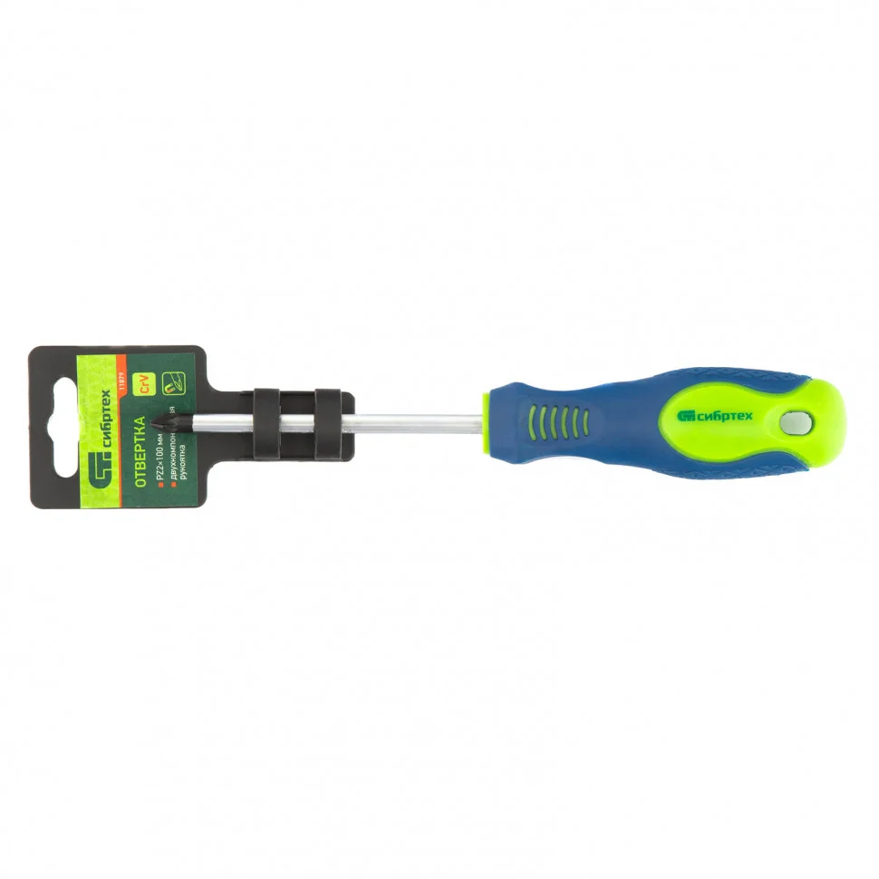 Отвертка Сибртех 11879, PZ2 х 100 мм, из стали CrV, с 2-х компонентной рукояткой, оснащена крестовым шлицем с 4 дополнительными насечками для лучшего сцепления с крепежом. Она подходит для монтажа/демонтажа крепежных элементов типа Pozidriv. Отвертка полупрофессионального класса поможет при сборке мебели, установке полок и т.д. Стержнем длиной 100 мм удобно работать на поверхностях и в углублениях.ПреимуществаВысокое качество исполнения — стержень выполнен из прочной хромованадиевой стали и закален до твердости 50-54 HRC.Фосфатированный шлиц — стержень надежно фиксируется в головке крепежа и не соскальзывает.Специальная маркировка — информация о типе шлица и длины стержня на рукоятке помогает легко найти отвертку в зоне хранения.Комфортная работа — двухкомпонентная рукоятка имеет противоскользящие ромбовидные насечки и подпальцевые выемки.