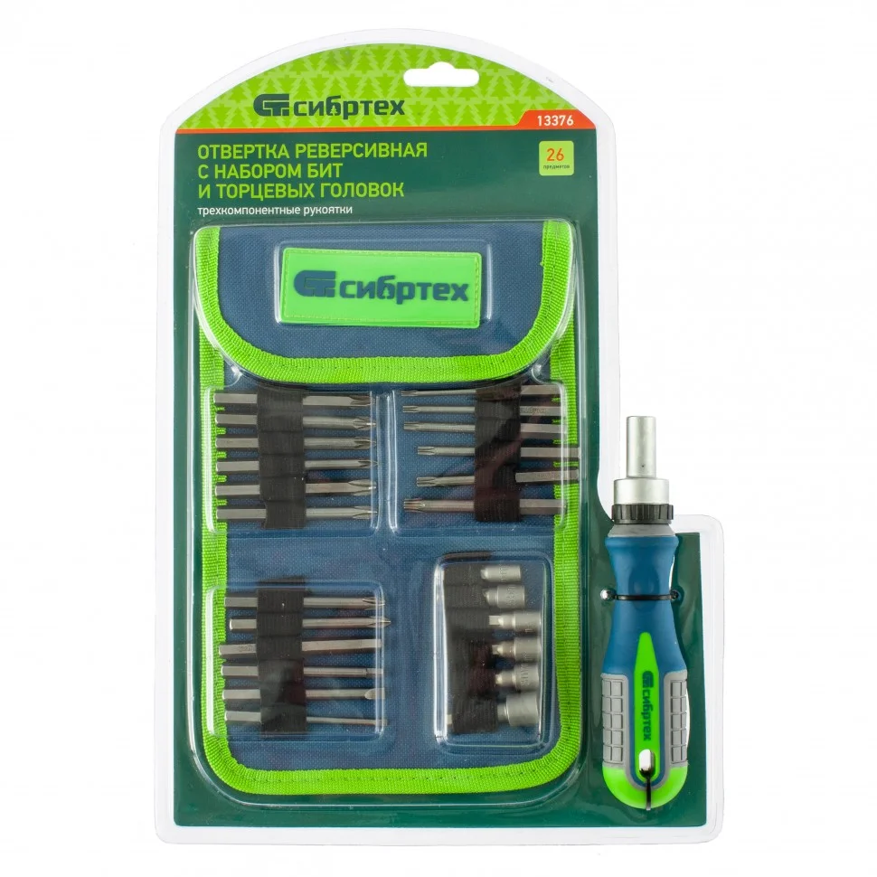 Реверсивная отвертка с набором бит и торцевых головок Сибртех 13376, 25 предметов из стали CrV в чехле, — это надежный инструмент для решения бытовых задач. С помощью сменных бит можно производить монтаж/демонтаж резьбовых соединений со шлицами SL, PH, PZ, TORX, HEX. А благодаря их удлиненной конструкции обеспечивается доступ к труднодоступным местам. Торцевые головки позволяют работать с болтами, гайками и другим крепежом.ПреимуществаВысококачественное исполнение — насадки выполнены из прочной и долговечной хромованадиевой стали с защитным покрытием.Высокая твердость — рабочие части закалены до 50-52 HRC, поэтому насадки выдерживают нагрузки.Наличие реверса — в процессе эксплуатации не нужно постоянно переставлять руку, что значительно повышает удобство работы.Универсальность — набор укомплектован битами наиболее распространенных размеров: SL3, SL5, PH1-3, PZ1-3, T10, Т15, Т20, Т25, Т30, Н4, H6.Надежный хват и комфортная работа — рукоятки имеют антискользящие резиновые насечки.Удобство хранения и транспортировки — комплект размещен в мягком тканевом чехле.