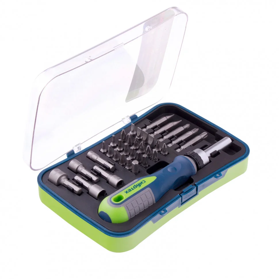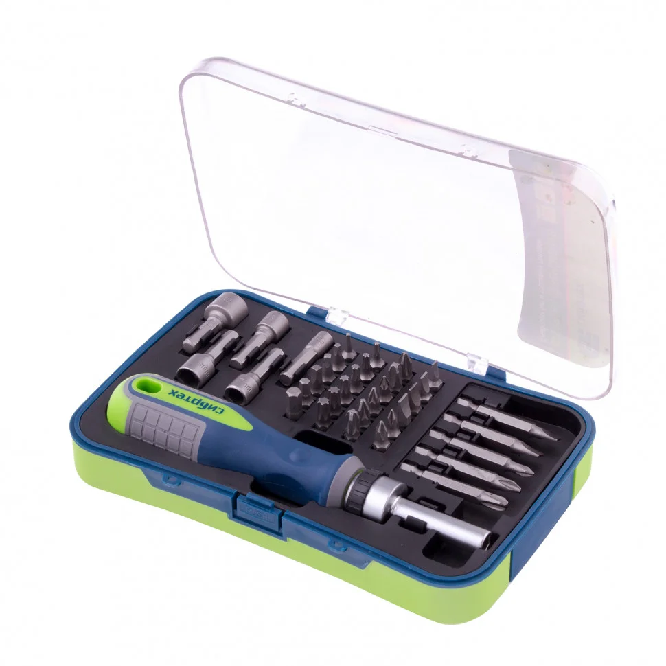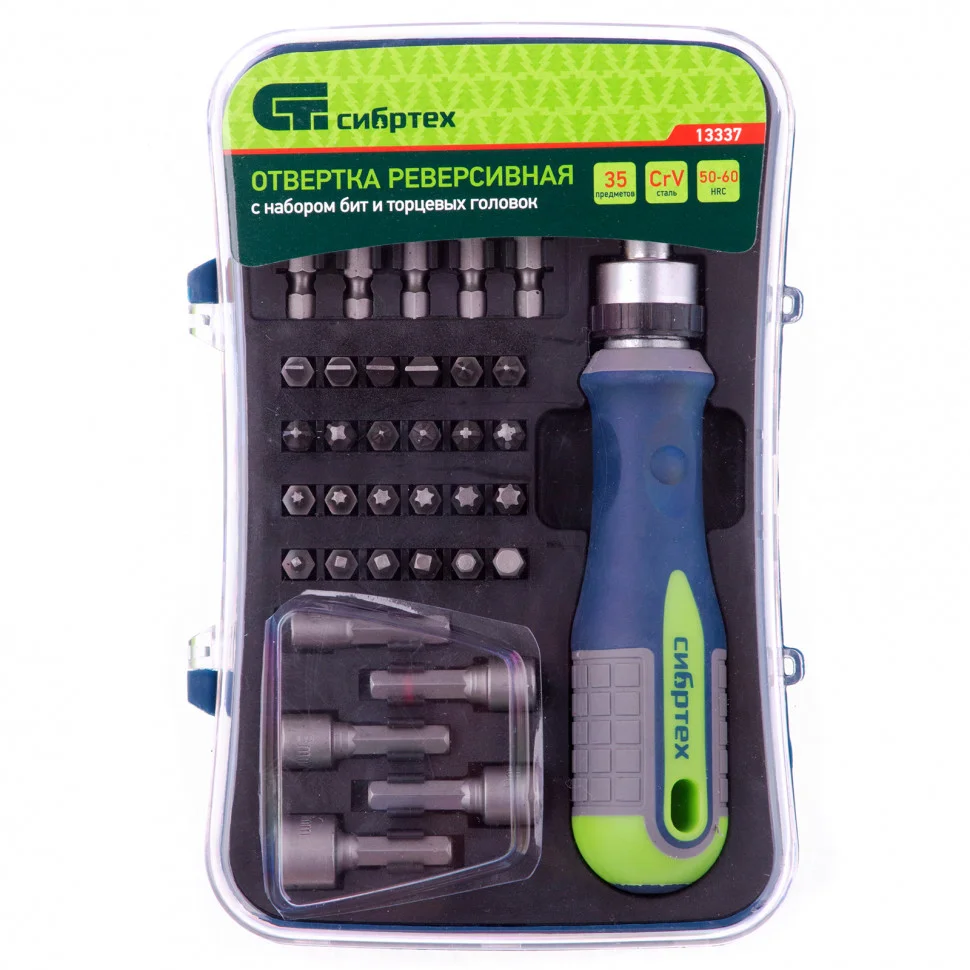 Реверсивная отвертка с набором бит и торцевыми головками Сибртех 13337, 35 инструментов, CrV, станет незаменимым помощником для частных мастеров при проведении ремонтных и монтажных работ. Удлиненные биты облегчают монтаж/демонтаж крепежных элементов в труднодоступных местах, торцевые головки позволяют работать с гайками, болтами, кровельными саморезами, имеющими внешний шестигранник и т.д.ПреимуществаНасадки и стержень отвертки изготовлены из хромованадиевой стали — прочного и износостойкого материала.Функция реверса обеспечивает удобство и высокую эффективность работы.Набор включает насадки PH, PZ, SL, HEX и TORX популярных размеров, что делает его универсальным.Двухкомпонентная рукоятка с антискользящим эффектом хорошо ложится в руку.Благодаря пластиковому кейсу набор удобно хранить и можно брать с собой.На рукоятке отвертки-держателя есть отверстие для подвесного хранения.