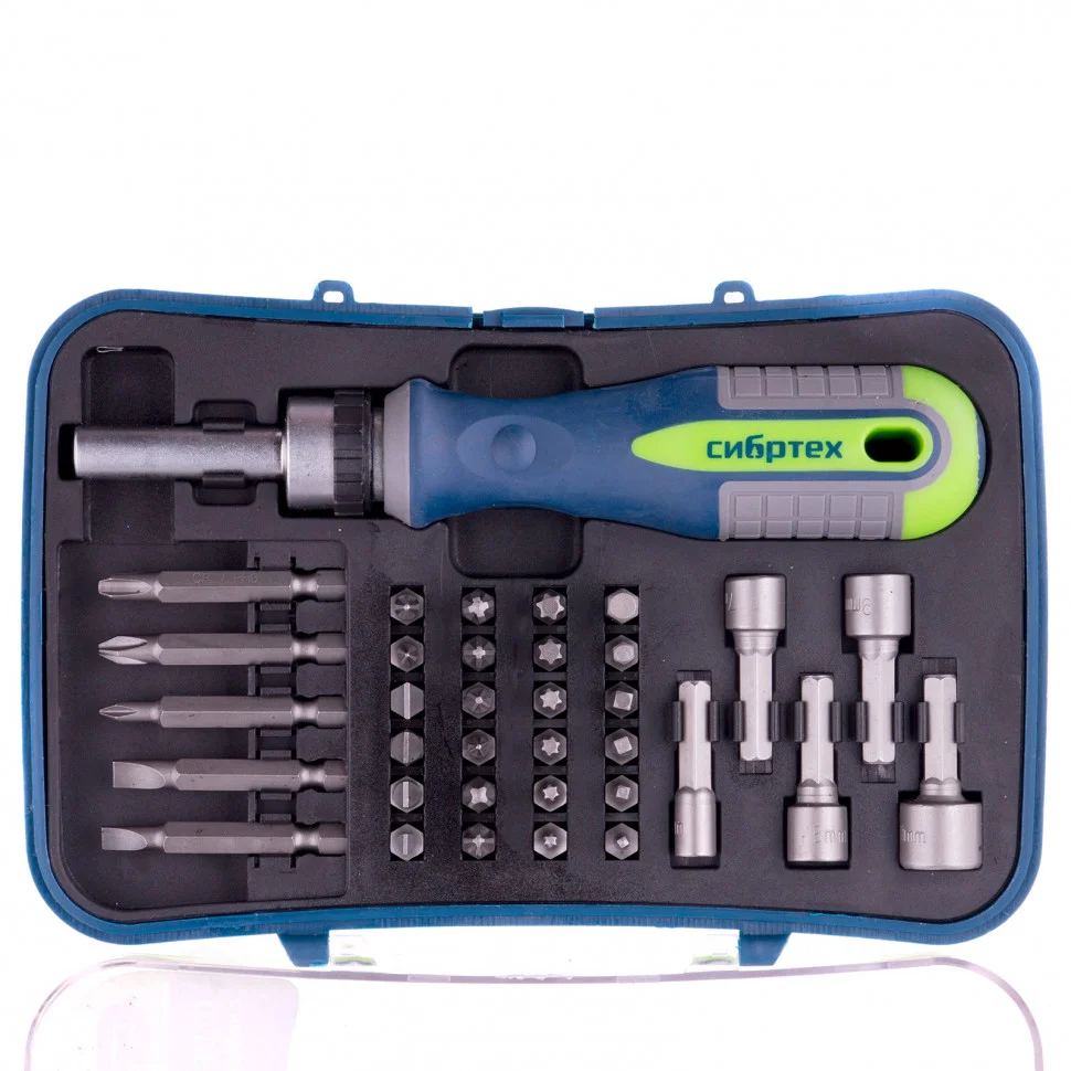Отвертка реверсивная с набором бит и торцевыми головками, 35 шт, CrV Сибртех 13337