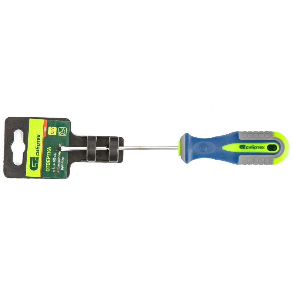 Отвертка Сибртех 11800, SL3,0 х 100 мм, из стали CrV, с 3-х компонентной рукояткой, пригодится для монтажа/демонтажа резьбовых соединений типа Slotted. С ее помощью можно осуществить работы, требующие полноценной затяжки крепежа. Стержнем длиной 100 мм удобно работать на поверхностях и в углублениях.ПреимуществаВысокие прочностные характеристики — стержень выполнен из хромованадиевой стали и закален до твердости 50-54 HRC.Фосфатированный наконечник — жало не соскальзывает с головки крепежа.Специальная маркировка — на рукоятку нанесено обозначение типа шлица и длины стержня для быстрого поиска нужной отвертки.Удобная рукоятка — квадратные насечки с подпальцевыми выемками снижают усталость рук при длительной работе.