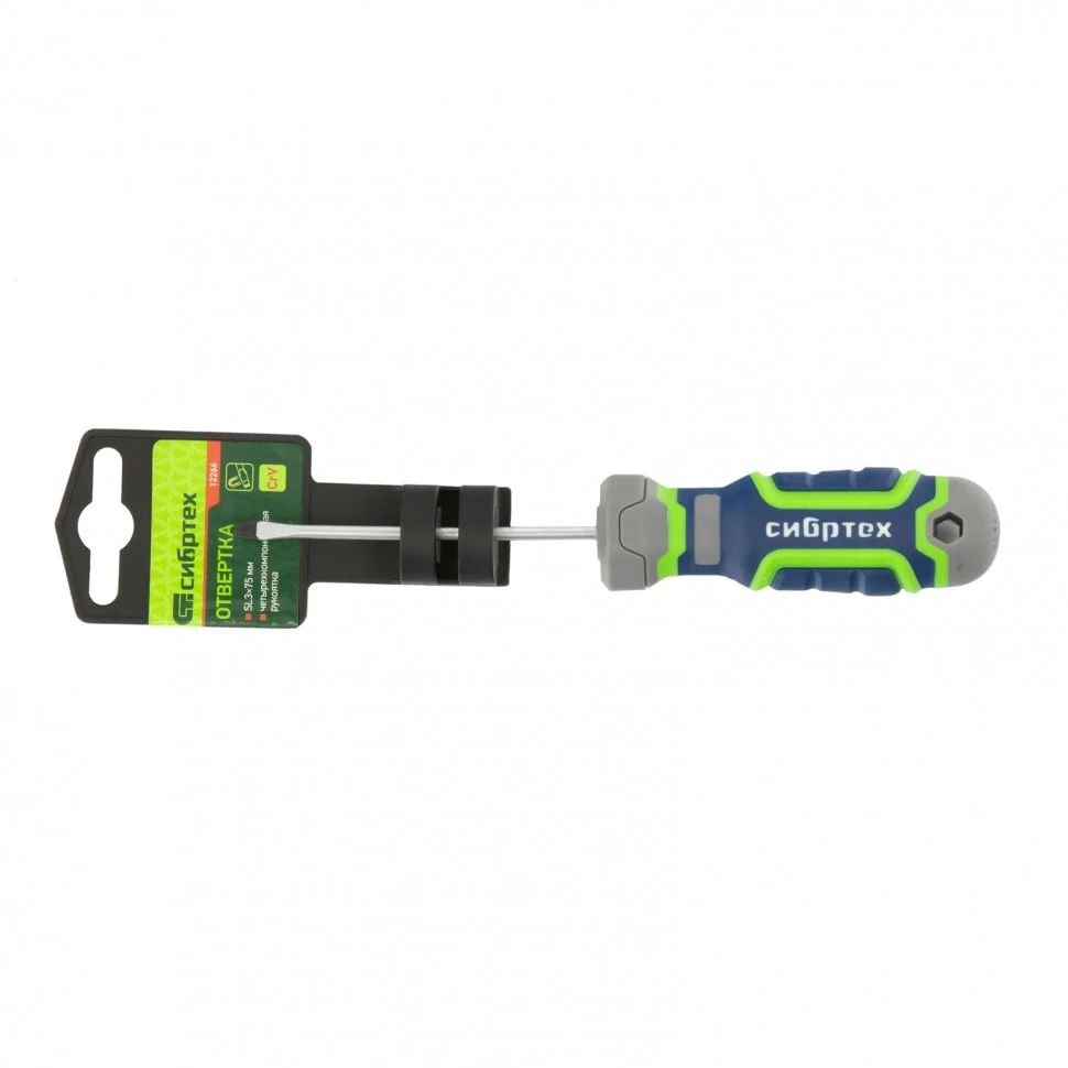 Отвертка Сибртех 12266, SL3,0 х 75 мм, из стали CrV, с 4-х компонентной рукояткой, используется при проведении работ, требующих приложения серьезного крутящего момента. Отвертка со шлицем Slotted подходит для закручивания и извлечения крепежа аналогичного типа. Стержнем длиной 75 мм удобно работать в углублениях и на поверхностях.ПреимуществаОтвертка отличается высоким качеством исполнения — стержень изготовлен из хромованадиевой стали, а шлиц закален до твердости 50-55 HRC.Намагниченное жало повышает удобство работы, т.к. избавляет от необходимости придерживать крепеж рукой.Шлиц фосфатирован для лучшего сцепления с головкой крепежа.Маркировка типа шлица и длины стержня на затыльнике рукояти позволяет легко найти отвертку в зоне хранения.Четырехкомпонентная рукоятка со сложной рельефной формой обеспечивает надежное удержание отвертки, снижает усталость рук и увеличивает передачу крутящего момента.