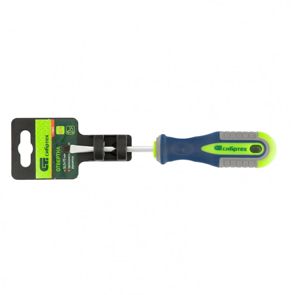 Отвертка Сибртех 11823, SL5,0 х 75 мм, из стали CrV, с 3-х компонентной рукояткой, пригодится для монтажа/демонтажа резьбовых соединений типа Slotted. С ее помощью можно осуществить работы, требующие полноценной затяжки крепежа. Стержнем длиной 75 мм удобно работать на поверхностях и в углублениях.ПреимуществаВысокие прочностные характеристики — стержень выполнен из хромованадиевой стали и закален до твердости 50-54 HRC.Фосфатированный наконечник — жало не соскальзывает с головки крепежа.Специальная маркировка — на рукоятку нанесено обозначение типа шлица и длины стержня для быстрого поиска нужной отвертки.Удобная рукоятка — квадратные насечки с подпальцевыми выемками снижают усталость рук при длительной работе.