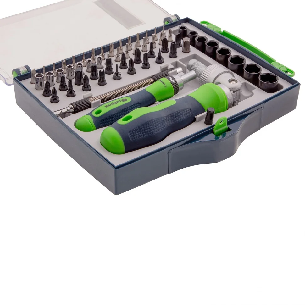Отвертки реверсивные с набором бит, торцевых головок, 61 предмет, CrV Сибртех 13363