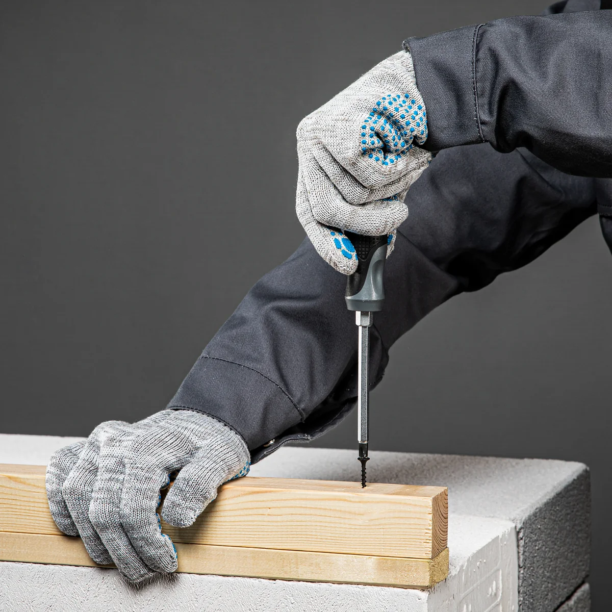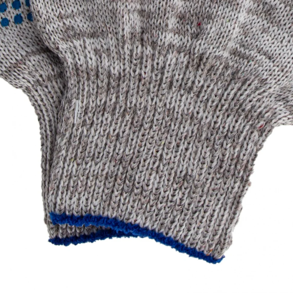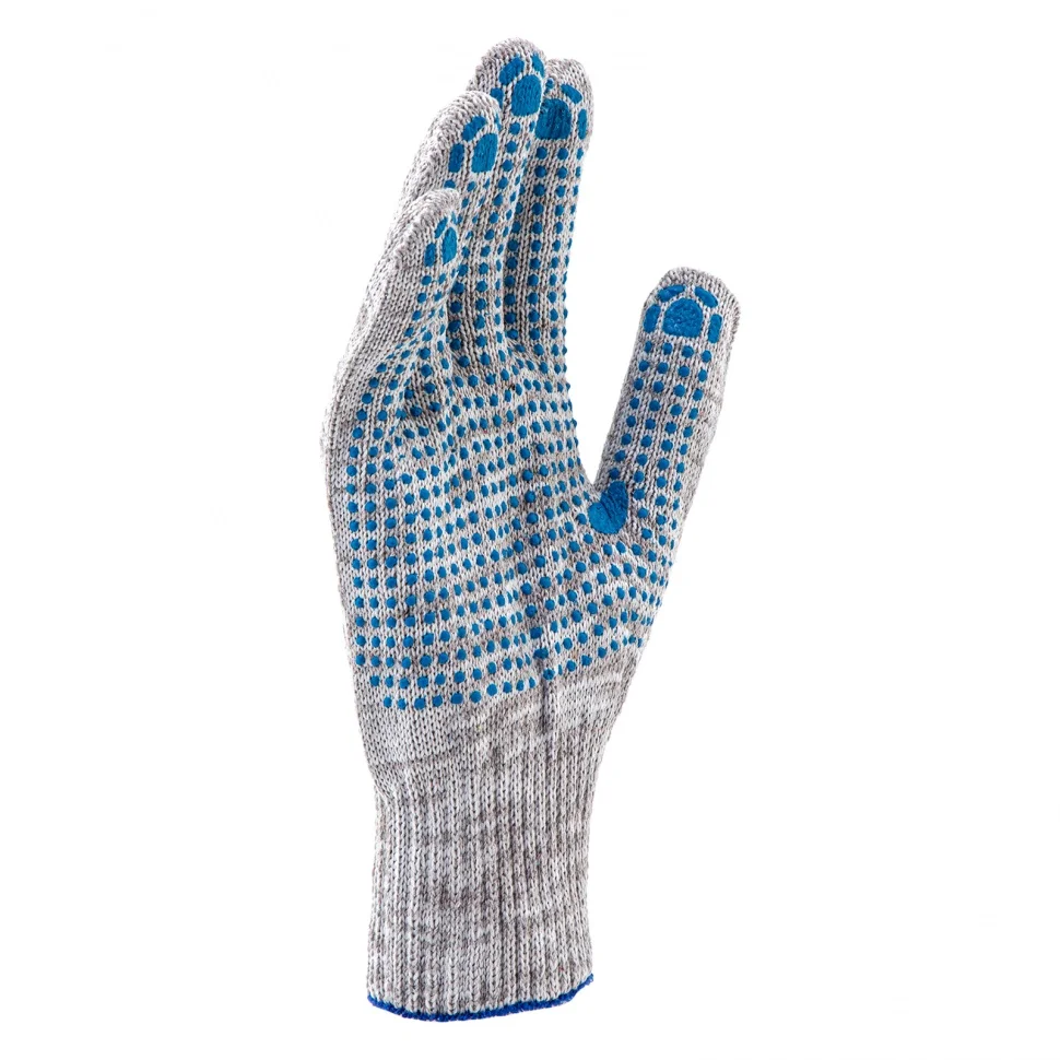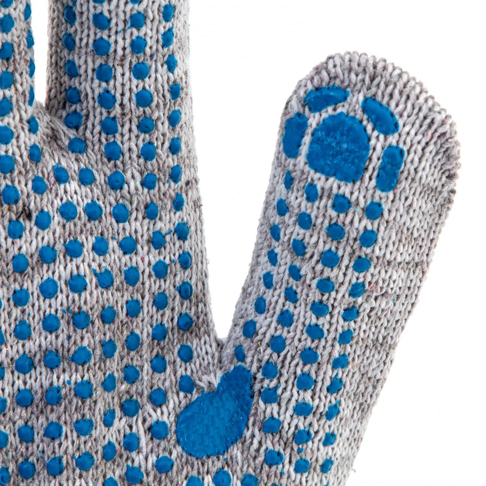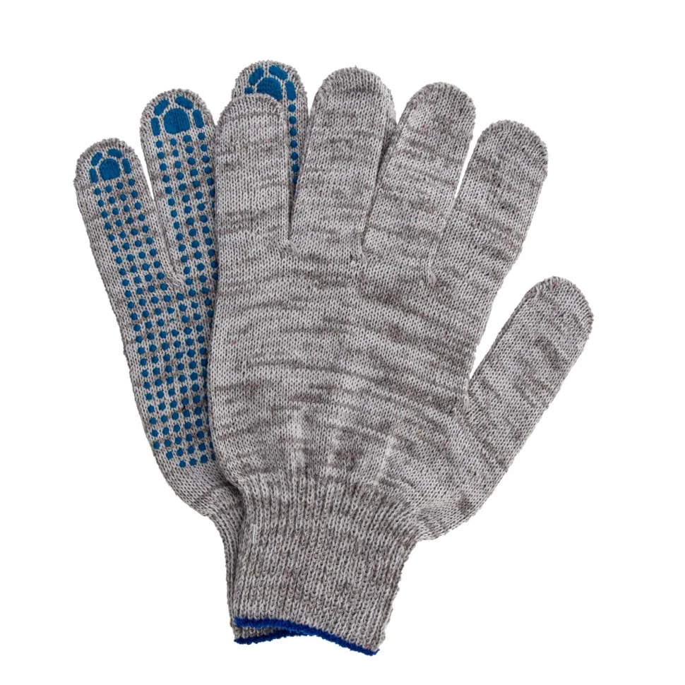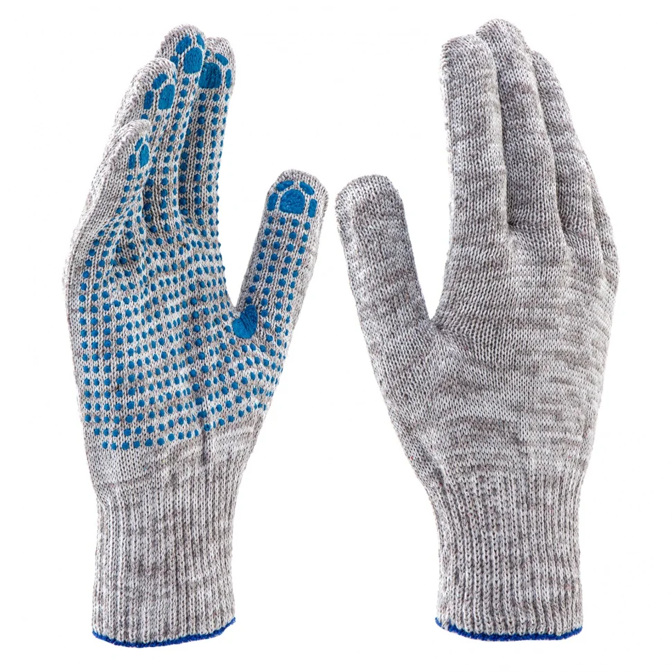 Трикотажные перчатки 67815 с ПВХ-покрытием «Точка», серый меланж, 10 класса вязки, защищают руки от царапин, порезов, ссадин, мозолей и загрязнений. Тонкая пряжа обеспечивает пальцам чувствительность, поэтому перчатки подходят для выполнения точных работ. Благодаря ПВХ-покрытию ладонной части инструменты не выскальзывают из рук. Перчатки используют в строительстве, на производстве, во время ремонта помещений и обслуживания автомобилей. Пригодятся они и в хозяйстве.ПреимуществаОснова выполнена из воздухопроницаемой хлопчатобумажной пряжи, поэтому руки в перчатках не потеют.В пряже содержится полиэфирная нить, что повышает прочность и эластичность перчаток.Покрытие из ПВХ препятствует истиранию, продлевая срок службы изделий.Манжеты плотно облегают запястья, обеспечивая удобную посадку перчаток на кистях рук.Материал перчаток не вызывает аллергии, поэтому их использование безвредно для здоровья.Перчатки не ограничивают движения пальцев, обеспечивая комфорт во время работы.