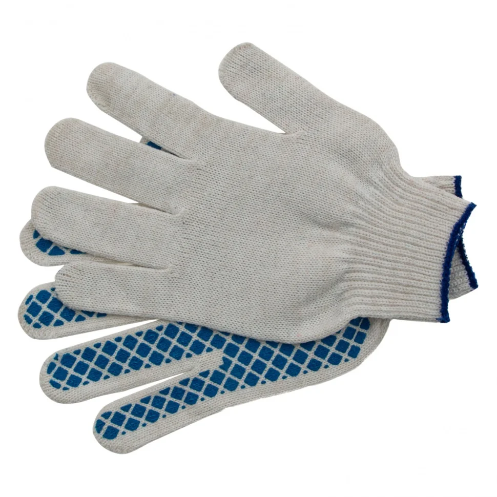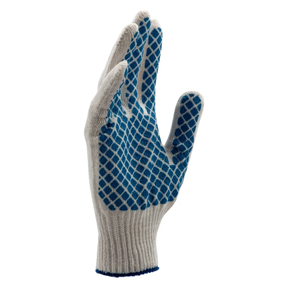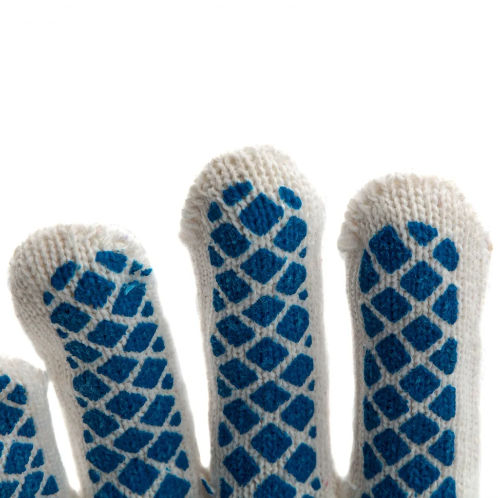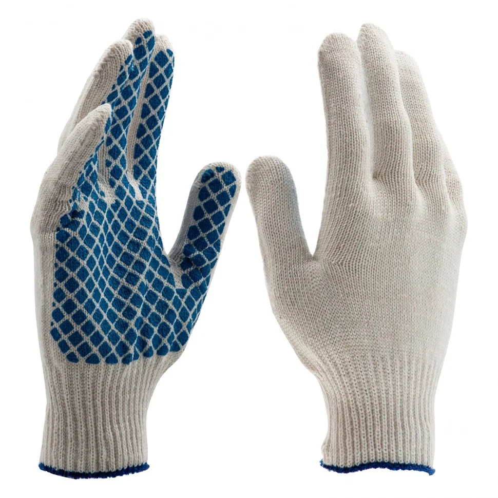 Трикотажные перчатки 67713 с ПВХ-покрытием «Шахматный облив», 10 класса вязки, защищают руки от царапин, порезов, ссадин, мозолей и загрязнений. Тонкая пряжа обеспечивает пальцам чувствительность, поэтому перчатки подходят для выполнения точных работ. Благодаря ПВХ-покрытию ладонной части инструменты не выскальзывают из рук. Перчатки используют в строительстве, на производстве, во время ремонта помещений и обслуживания автомобилей. Пригодятся они и в хозяйстве.ПреимуществаОснова выполнена из воздухопроницаемой хлопчатобумажной пряжи, поэтому руки в перчатках не потеют.В пряже содержится полиэфирная нить, что повышает прочность и эластичность перчаток.Покрытие из ПВХ препятствует истиранию, продлевая срок службы изделий.Манжеты плотно облегают запястья, обеспечивая удобную посадку перчаток на кистях рук.Материал перчаток не вызывает аллергии, поэтому их использование безвредно для здоровья.Перчатки не ограничивают движения пальцев, обеспечивая комфорт во время работы.