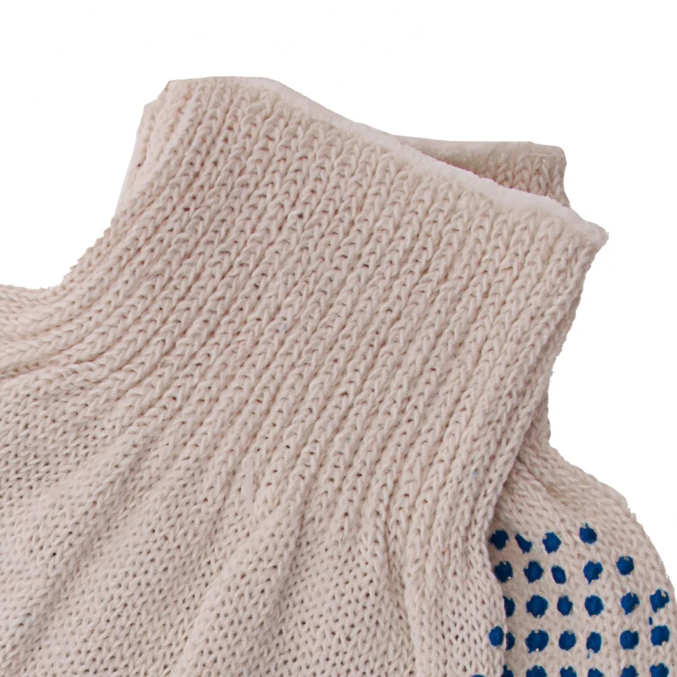Трикотажные перчатки 67785 с ПВХ-покрытием «Точка», 10 класса вязки, защищают руки от царапин, порезов, ссадин, мозолей и загрязнений. Тонкая пряжа обеспечивает пальцам чувствительность, поэтому перчатки подходят для выполнения точных работ. Благодаря ПВХ-покрытию ладонной части инструменты не выскальзывают из рук. Перчатки используют в строительстве, на производстве, во время ремонта помещений и обслуживания автомобилей. Пригодятся они и в хозяйстве.ПреимуществаОснова выполнена из воздухопроницаемой хлопчатобумажной пряжи, поэтому руки в перчатках не потеют.В пряже содержится полиэфирная нить, что повышает прочность и эластичность перчаток.Покрытие из ПВХ препятствует истиранию, продлевая срок службы изделий.Манжеты плотно облегают запястья, обеспечивая удобную посадку перчаток на кистях рук.Материал перчаток не вызывает аллергии, поэтому их использование безвредно для здоровья.Перчатки не ограничивают движения пальцев, обеспечивая комфорт во время работы.