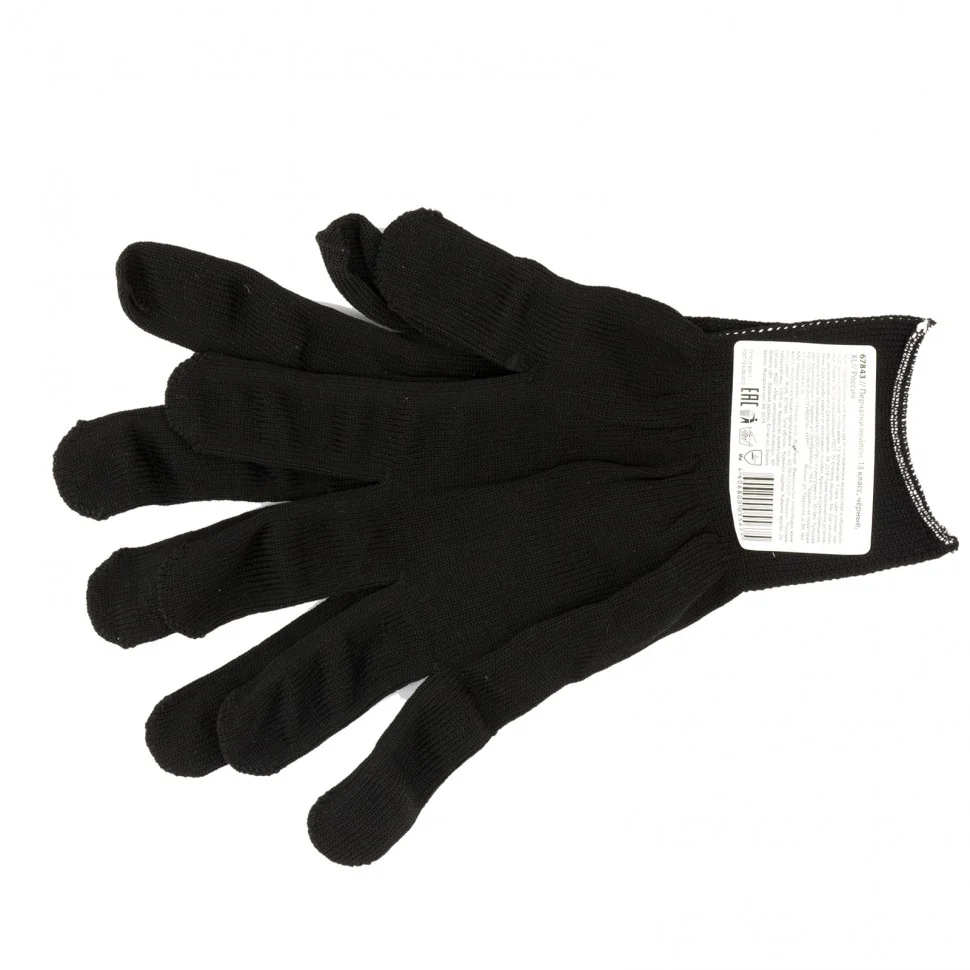 Черные перчатки 67843 из синтетической нити 13 класса вязки, размер XL, надежно защищают руки от мозолей, ссадин, царапин и порезов. Тонкая ткань обеспечивает высокую тактильную чувствительность пальцев, поэтому перчатки подходят для работы с мелкими предметами. Будут полезны во время строительства, ремонта, сборочных работ, а также в быту.ПреимуществаПерчатки из плотной нейлоновой пряжи устойчивы к истиранию и разрыву, поэтому прослужат долго.Материал перчаток воздухопроницаем, поэтому руки в них не потеют.Эластичные манжеты плотно облегают запястья, обеспечивая надежную фиксацию перчаток на кистях рук.Ткань перчаток приятна на ощупь, поэтому в них комфортно работать.Материал, из которого изготовлены перчатки, гипоаллергенен, а значит, работа в них не вредит здоровью.