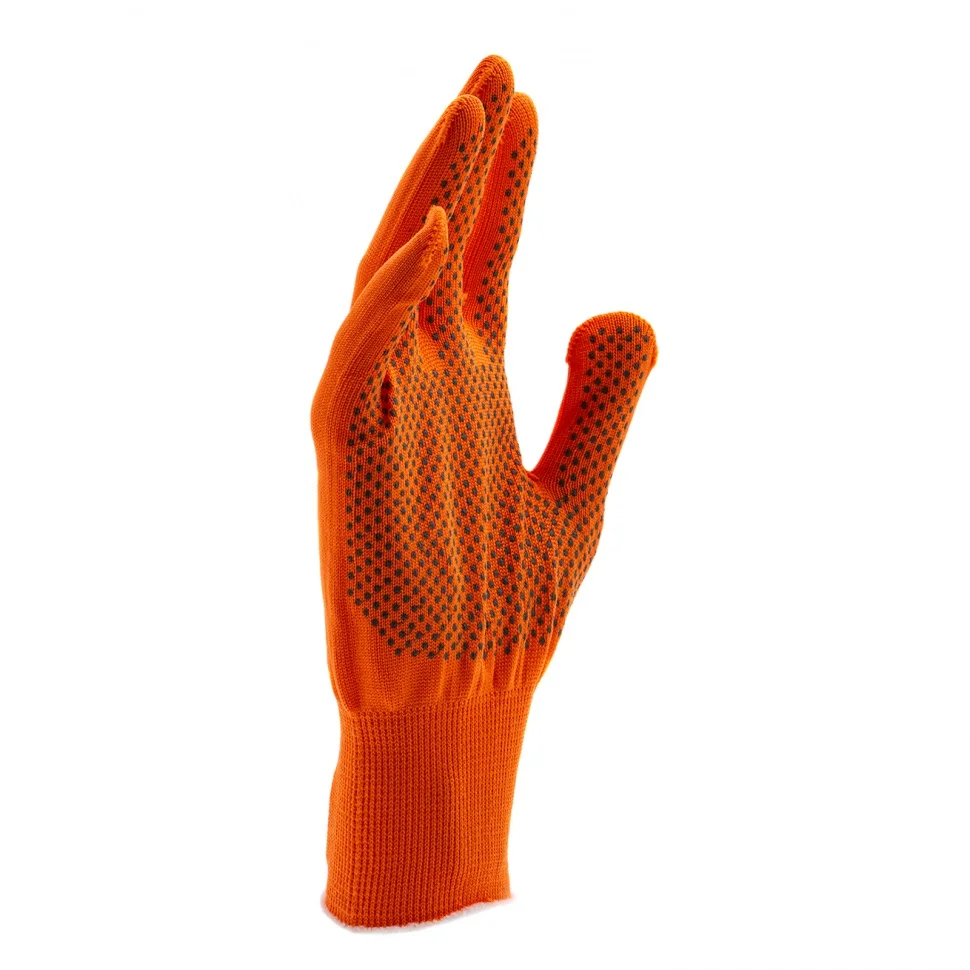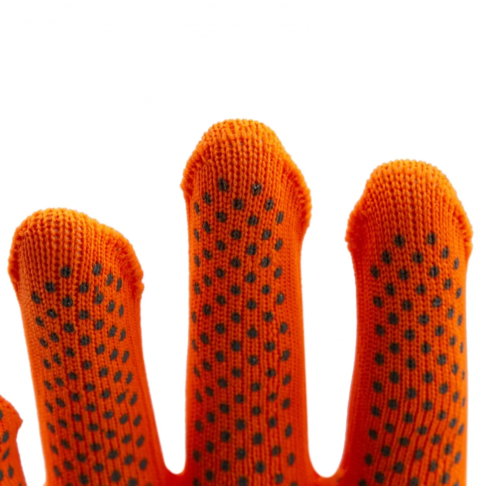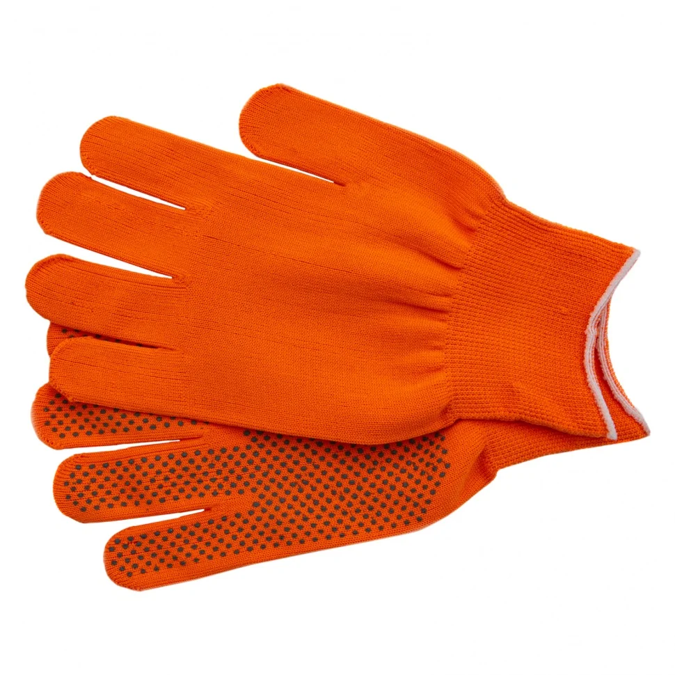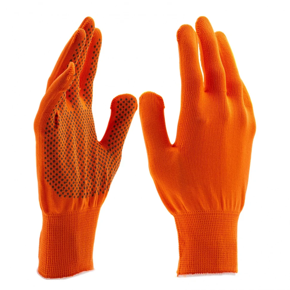 Оранжевые перчатки из синтетической нити 67845 с ПВХ точкой, 13 класс вязки, размера XL, применяются для защиты рук от царапин и ссадин. Они станут незаменимым помощником при осуществлении строительных, ремонтных, садовых и других работ. Плотная ткань из тонких синтетических нитей сохраняет высокую чувствительность пальцев, что особенно актуально при проведении точных работ.ПреимуществаНейлоновые нити — перчатки гипоаллергенны, обладают высокой устойчивостью к истиранию и пропускают воздух, поэтому в них удобно работать.Эластичные манжеты — перчатки надежно фиксируются на запястье и не спадают.Точечное ПВХ-покрытие — инструменты не будут выскальзывать из рук.