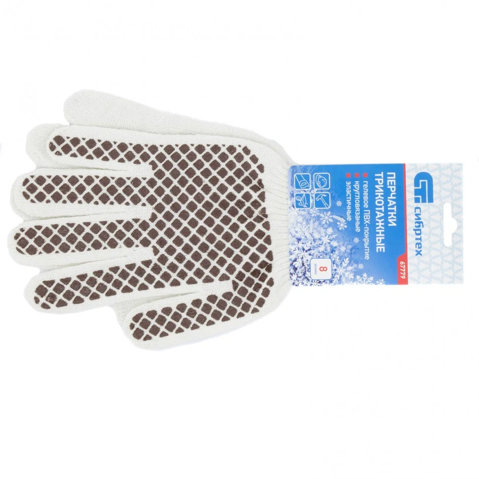 Трикотажные перчатки Сибртех 67779 с рисунком из ПВХ-геля «Шахматный облив», обработанные оверлоком, предназначены для защиты рук от травм и загрязнений. Тонкое полотно 10 класса вязки сохраняет чувствительность пальцев, необходимую для выполнения точных работ. Гелевое ПВХ-покрытие препятствует выскальзыванию инструментов и различных деталей. Перчатки используются при проведении строительных, монтажных, механосборочных, автослесарных работ, также будут полезны в быту.ПреимуществаКомфорт во время работы — натуральная хлопчатобумажная основа обеспечивает хороший воздухообмен, поэтому руки не потеют.Прочность и эластичность — в пряжу добавлена полиэфирная нить, устойчивая к разрыву.Долговечность — покрытие из ПВХ-геля предохраняет изделия от истирания, а края манжет обработаны оверлоком, что повышает их износостойкость.Свобода движений — перчатки удобно садятся по руке.Надежная фиксация на кистях рук — эластичные манжеты плотно облегают запястья, препятствуя сползанию перчаток.Безопасность — материал перчаток не вызывает аллергии и безвреден для здоровья.