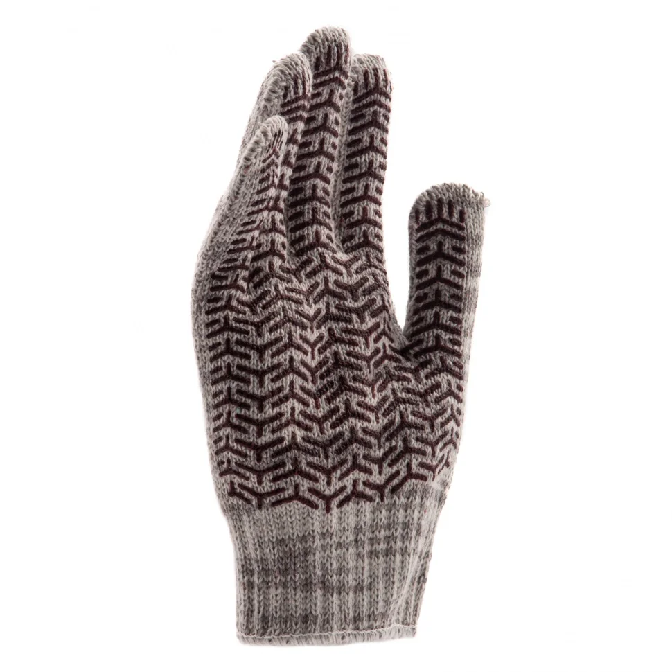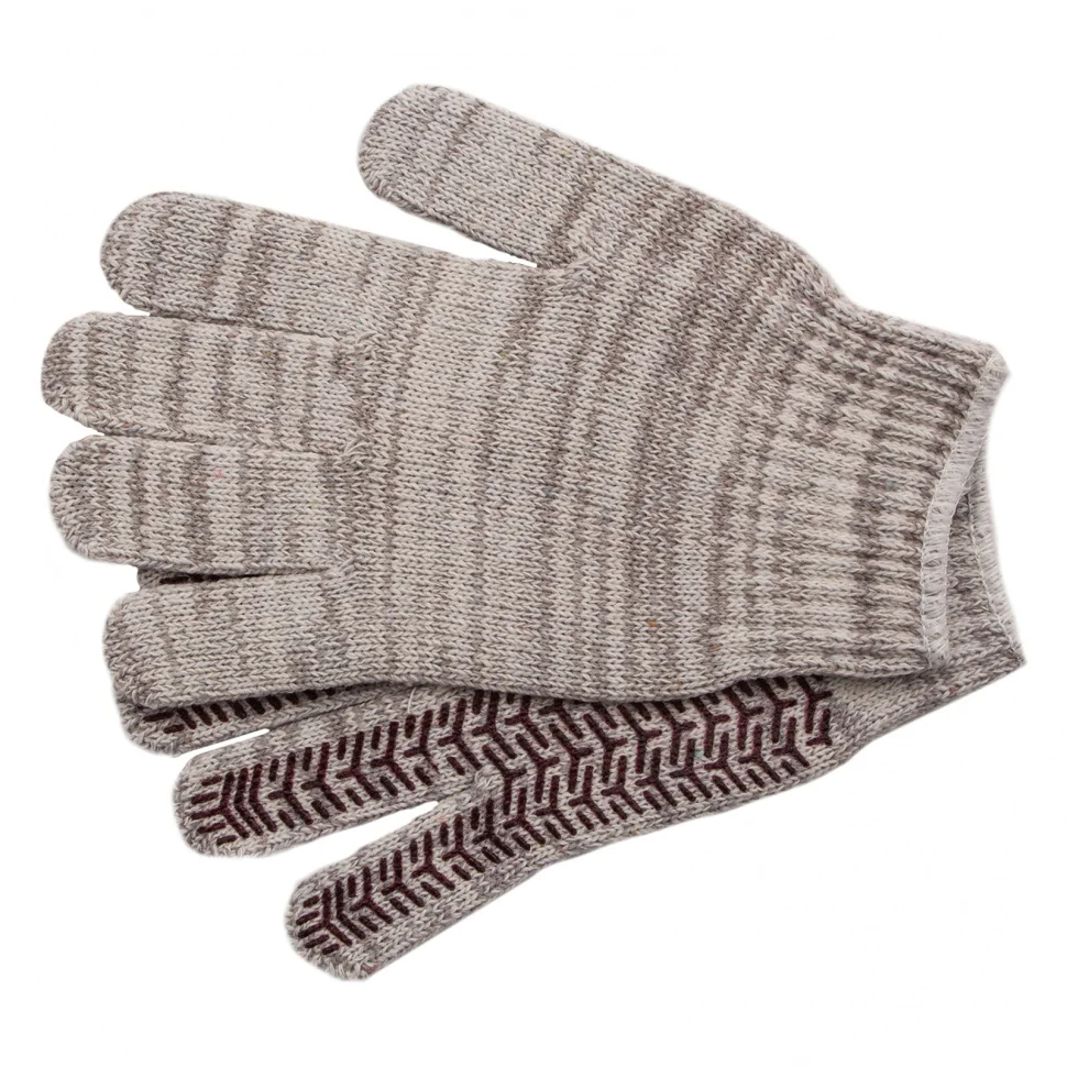 Усиленные трикотажные перчатки Сибртех 68182, бело-серый меланж, с гелевым ПВХ-покрытием, 7 класса вязки, надевают на руки при выполнении тяжелых строительных, монтажных, ремонтных, сборочных и погрузо-разгрузочных работ. Толстая эластичная пряжа надежно защищает кисти рук от травм и попадания грязи, не препятствуя движениям пальцев. Нанесенный на ладонную сторону ПВХ-гель исключает скольжение и способствует надежному захвату инструментов и других предметов.ПреимуществаКомфорт во время работы — руки в перчатках не потеют, т.к. хлопчатобумажная основа обеспечивает хороший воздухообмен.Долговечность — ПВХ-покрытие снижает истираемость, а полиэфирная нить в составе увеличивает прочность.Удобная посадка по руке — эластичные манжеты надежно фиксируются на запястьях, благодаря чему перчатки не сползают с кистей рук.Безопасность — материал основы гипоаллергенен, поэтому использование перчаток не вредит здоровью.