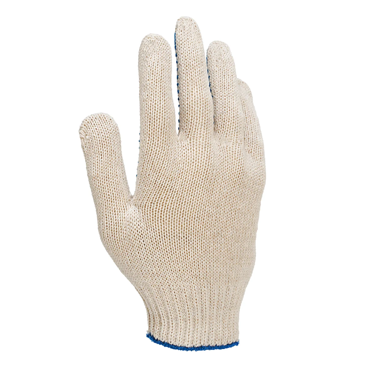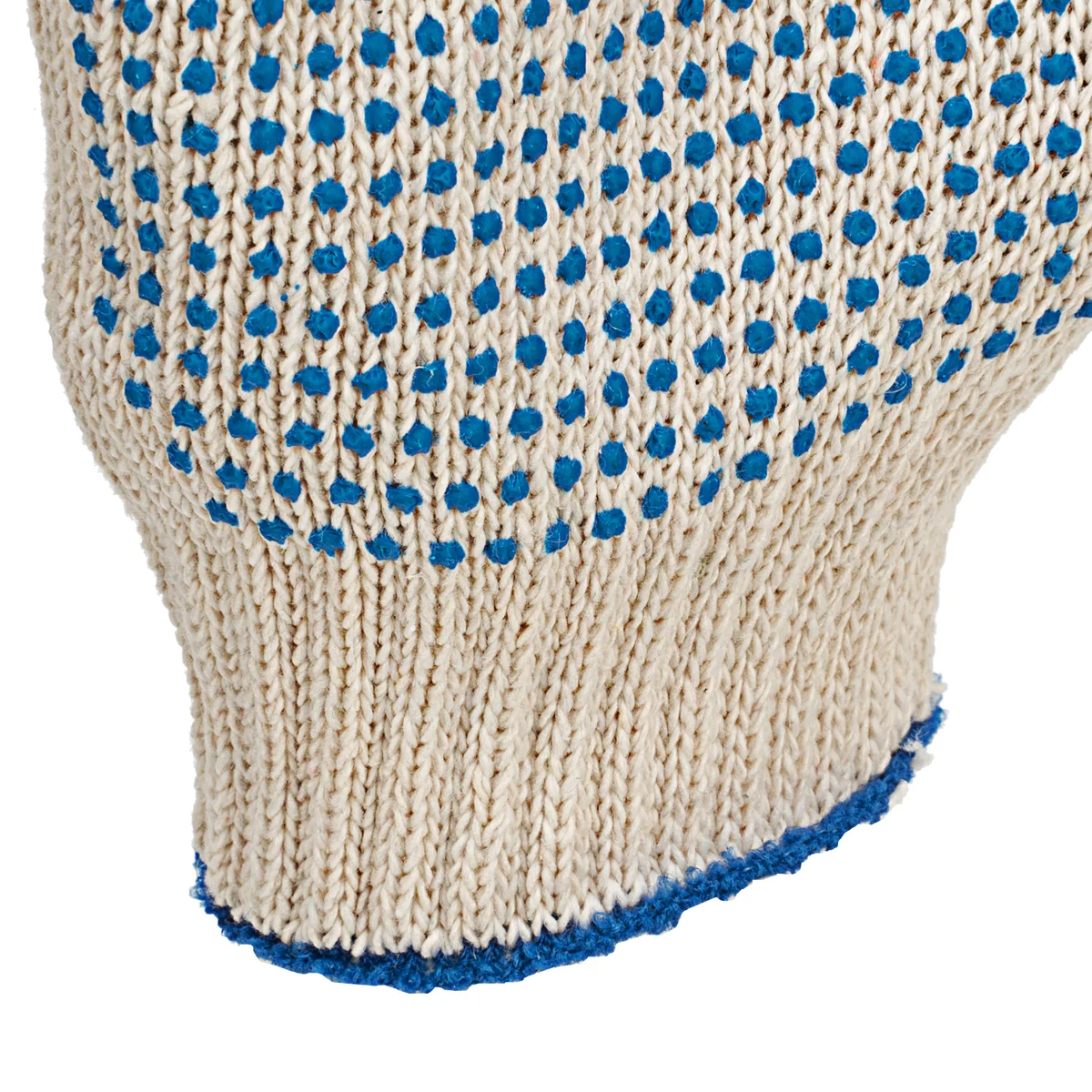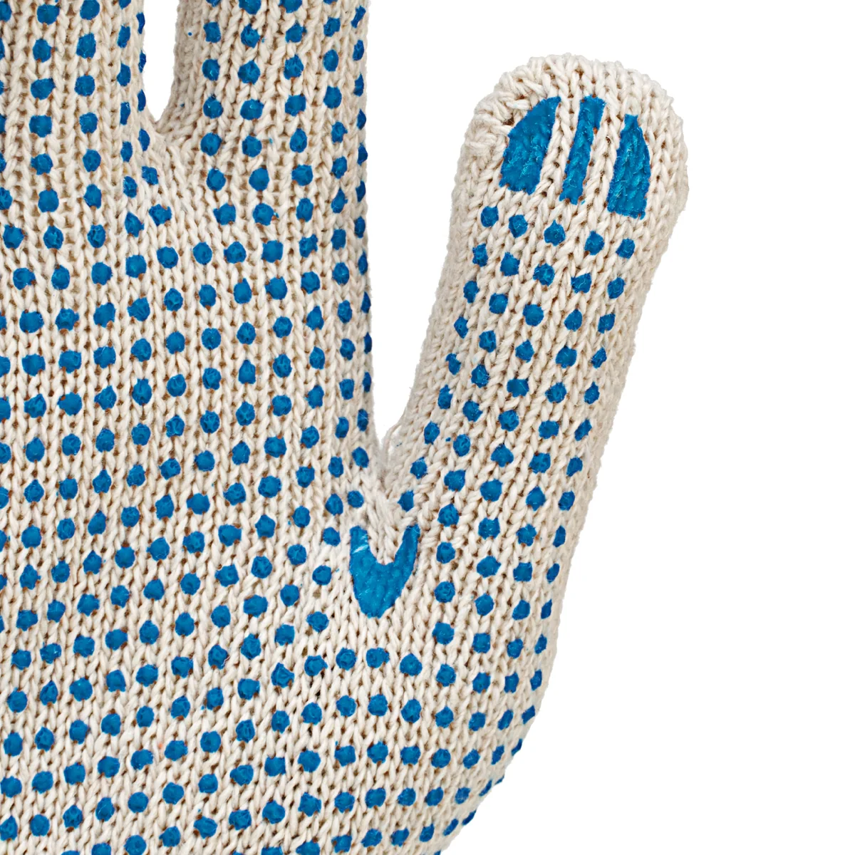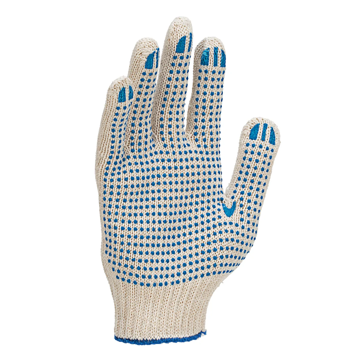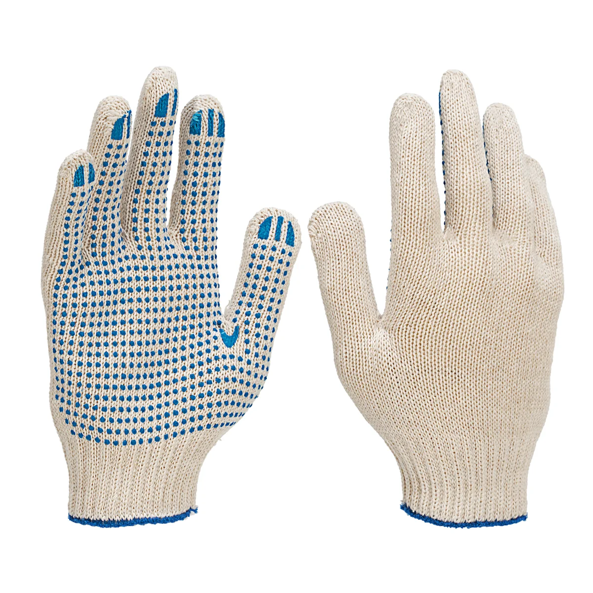 Усиленные трикотажные перчатки 677725 с ПВХ-точкой предназначены для проведения ремонтных, строительных и механосборочных работ. Защищают руки мастера от травм и загрязнений. Изготовлены из пряжи 7 класса вязки, поэтому хорошо тянутся и легко надеваются. Перчатки будут полезны в промышленности, на строительной площадке, а также при выполнении погрузочно-разгрузочных и хозяйственных работ.ПреимуществаХороший воздухообмен — благодаря хлопчатобумажной основе руки в перчатках не потеют.Высокий ресурс — полиэфирная нить в составе пряжи обеспечивает перчаткам прочность и эластичность.Нескользящее покрытие — ПВХ-точка хорошо сцепляется с рабочей поверхностью, что обеспечивает надежный захват материалов и инструментов.Надежная фиксация — эластичные манжеты плотно облегают запястья.Комфортная работа — перчатки не стесняют движений пальцев.Гипоаллергенность — благодаря натуральному материалу основы изделиями могут пользоваться люди с чувствительной кожей.