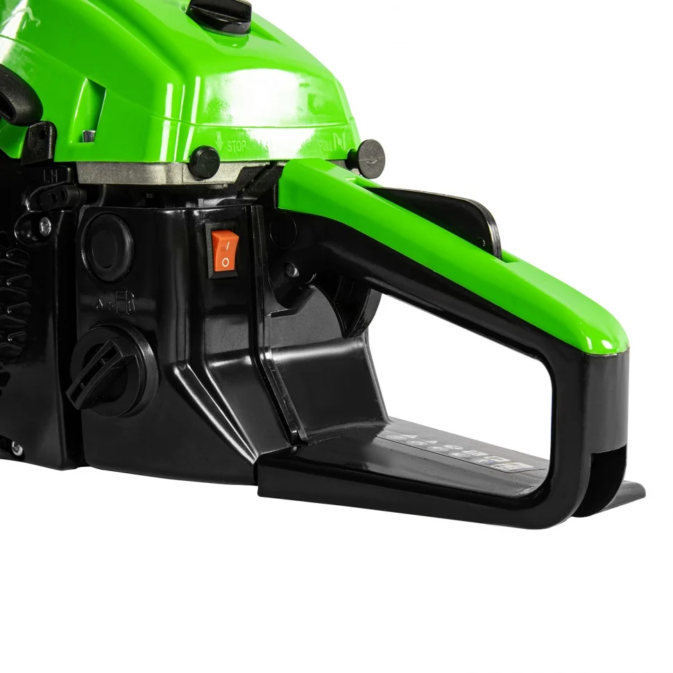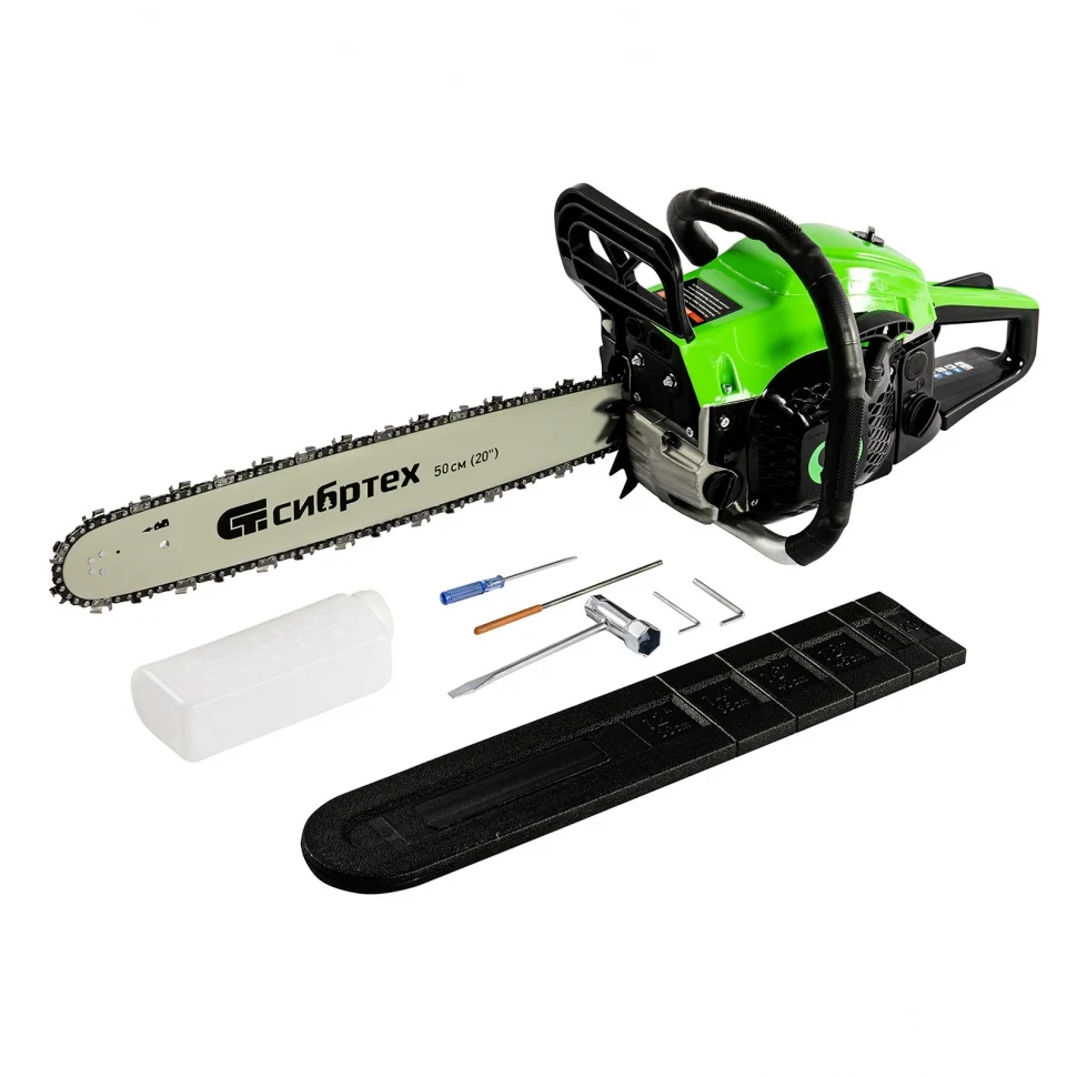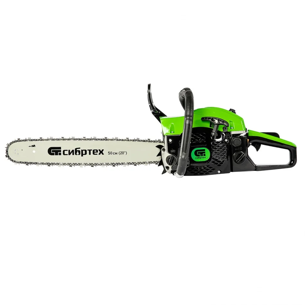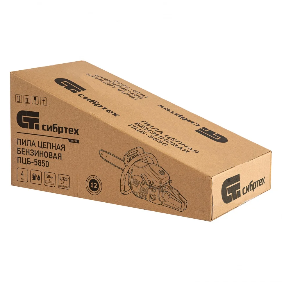Пила цепная бензиновая Сибртех ПЦБ-5850 95206 мощностью 4,0 л.с. комплектуется шиной длиной 50 см с 76 звеньями (шаг 0,325″, паз 1,5 мм). подойдет для валки деревьев различных пород, подготовки дров к отопительному сезону, подравнивания крон, подпила сучьев и других задач на приусадебных участках. Оптимальна для бытового использования. Благодаря надежному механизму сцепления бензопила изнашивается медленнее, что позволяет работать с высокой нагрузкой и не бояться преждевременных разрушений.ПреимуществаЗащита от случайного пуска — блокиратор газа не дает цепи вращаться, пока пользователь не нажмет на него.Защита двигателя от загрязнения и поломок — воздушный фильтр задерживает пыль, опилки и другие частицы, не давая им проникнуть внутрь инструмента.Безопасность — при отскоке пилы моментально срабатывает тормоз и цепь останавливается.Автоподкачка топлива — праймер позволяет быстро запустить пилу, достаточно лишь несколько раз нажать на него.Автоматическая система смазывания цепи — к пильной фурнитуре подается необходимое количество масла, в зависимости от скорости оборотов двигателя, что позволяет сохранить высокий ресурс ходовых частей.Эффективная работа — стальной зубчатый упор помогает добиться точного надпила перед валкой дерева и уменьшает отдачу от пилы, поэтому мастеру будет легче удерживать ее.Бесключевое натяжение цепи — удобный винт на боковой части корпуса обеспечивает быстрое и легкое обслуживание пильной фурнитуры.Комфортная работа — антивибрационная система снижает воздействие на суставы и систему кровообращения мастера, позволяя избежать проблем со здоровьем при частом использовании бензопилы.Удобный хват — эргономичные рукоятки с подпальцевыми выемками облегчают работу.