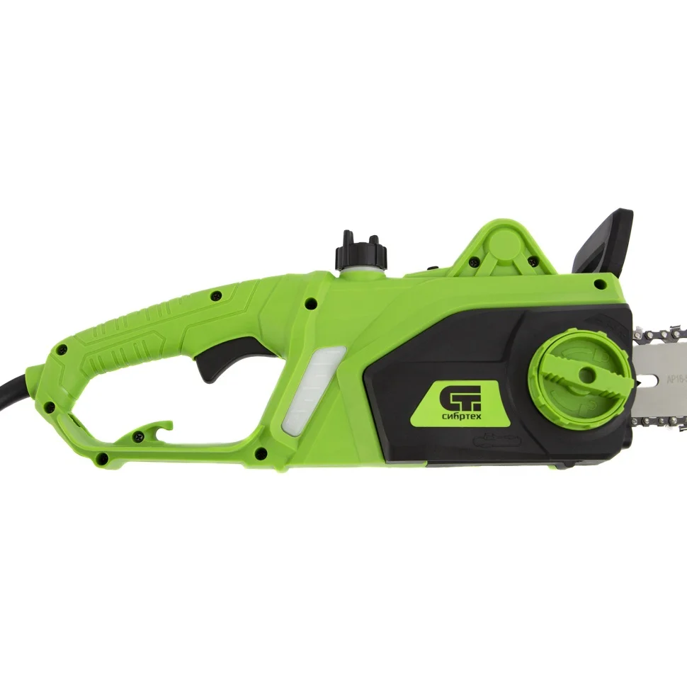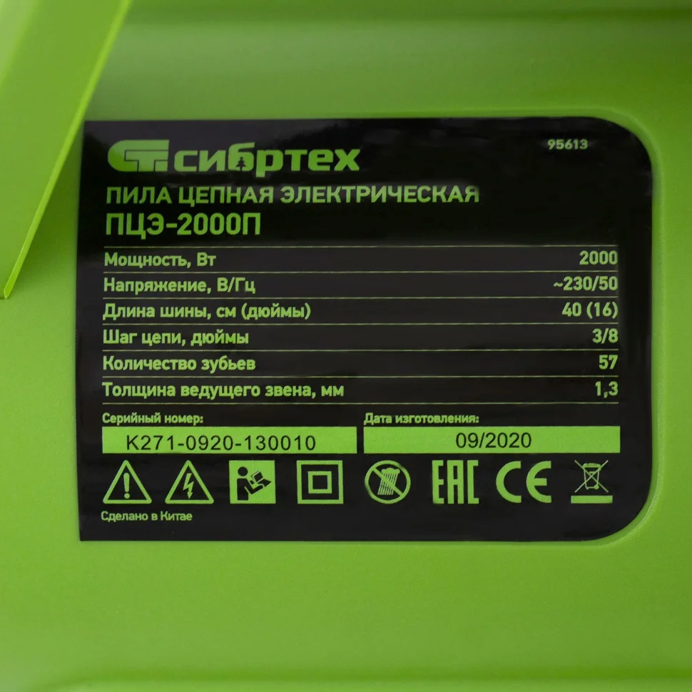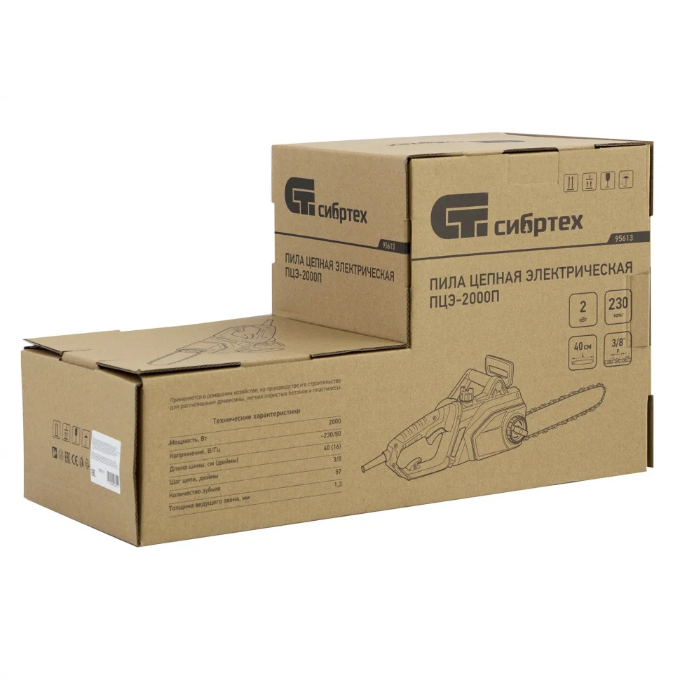 Электрическая цепная пила Сибртех ПЦЭ-2000П 95613 мощностью 2,0 кВт, с поперечным двигателем, комплектуется шиной длиной 16'' (40 см). Скорость движения цепи 13,5 м/с позволяет эффективно справляться с распилом деревянных заготовок, благоустройством дачного участка, ремонтом и частным строительством.Пила абсолютно экологична, потому что не производит выхлопов в окружающую среду. Электродвигатель экономит время на техническое обслуживание — не нужно готовить топливную смесь и беспокоиться о ее количестве в баке. Инструмент отличается низким уровнем шума по сравнению с бензиновыми моделями, поэтому мастеру будет комфортно работать как на открытых участках, так и в помещениях.ПреимуществаПоперечное расположение двигателя — пила компактна, весит всего 5,6 кг, эффективна при вертикальном распиливании древесины, ее легко удерживать.Высокий ресурс — медная обмотка двигателя обеспечивает стабильную работу при высоких нагрузках, что позволяет использовать инструмент долгое время.Защита от случайного пуска — двигатель включается только при одновременном нажатии клавиши блокировки и выключателя.Безопасность — рядом с передней рукояткой расположен щиток цепного тормоза, в случае отскока пилы рука ударяет по нему и цепь автоматически останавливается.Высокий ресурс — вентиляционные отверстия предотвращают перегрев двигателя при работе летом или при длительной эксплуатации.Качественная пильная фурнитура — шина с цепью изготовлены из прочной стали с контролем термообработки и закалены до твердости 65 и 35-40 HRC соответственно.Бесключевое натяжение цепи — достаточно одной рукой вращать регулировочный винт на боковой части корпуса.Точная работа — зубчатый упор помогает фиксировать инструмент при распиливании бревен или деревьев и позволяет тратить меньше сил.Автоматическая система смазывания цепи — к пильной фурнитуре подается нужное количество масла, что защищает ходовые части от трения и износа.Антивибрационная система — снижение отдачи при работе пилой позволяет сохранить здоровыми суставы и сосуды рук мастера.Надежное удерживание — две рукоятки обеспечивают крепкий захват инструмента.Визуальный контроль — полупрозрачный масляный бак со смотровым окошком помогает отслеживать уровень масла и вовремя доливать его, обеспечивая сохранность ходовых деталей.Быстрый доступ к щеткам двигателя — пользователю не обязательно обращаться в сервисный центр при их износе, он может производить замену самостоятельно.Специальный крючок — кабель можно зафиксировать, избежав поломки и внезапного отключения электропилы.Ремонтопригодность — шестерни сделаны съемными для быстрой замены.
