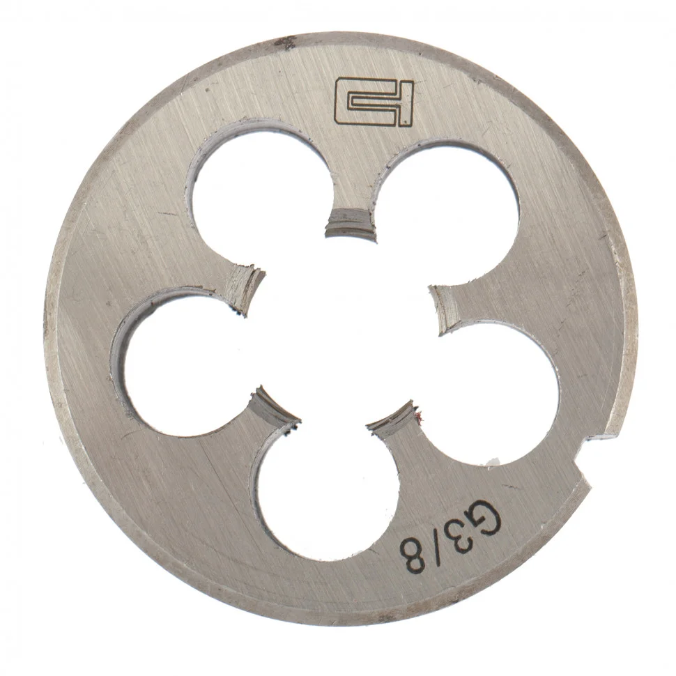 Плашка Сибртех 77138, G3/8, предназначена для нарезания дюймовой резьбы на трубах. С ее помощью можно осуществить слесарные и монтажные работы в мастерской, гараже, дома. Благодаря цельному корпусу плашка нарезает высококачественную резьбу, т.к. полностью захватывает деталь.ПреимуществаНадежность и долговечность плашки достигается за счет инструментальной стали 9XC, из которой она изготовлена.Твердость режущих кромок 60 HRC соответствует стандартам ГОСТа.За счет глубоких зон для отвода стружки плашка обеспечивает высокую скорость нарезки.Благодаря крупной маркировке с обозначением размера плашку легко найти среди других инструментов.Высокий класс точности 6Н является гарантией соответствия резьбы европейским стандартам качества.