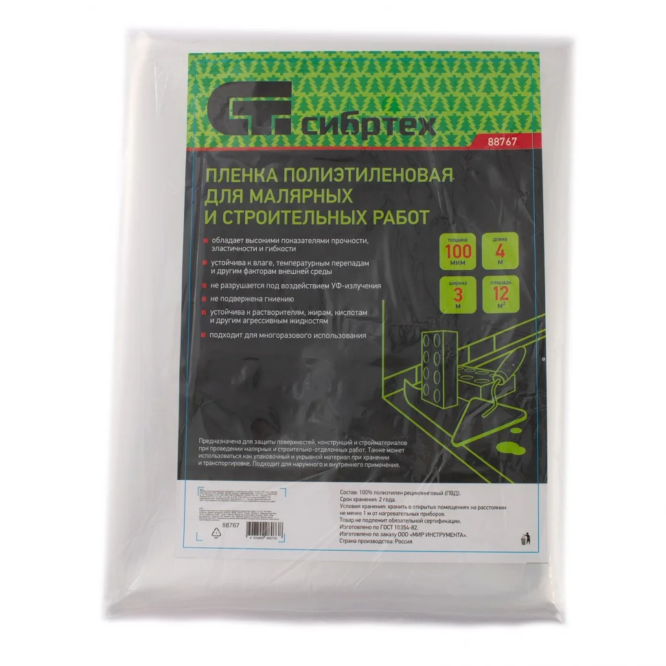 Пленка полиэтиленовая для малярных и строительных работ, 3 х 4 м, 100 мкм Сибртех 88767